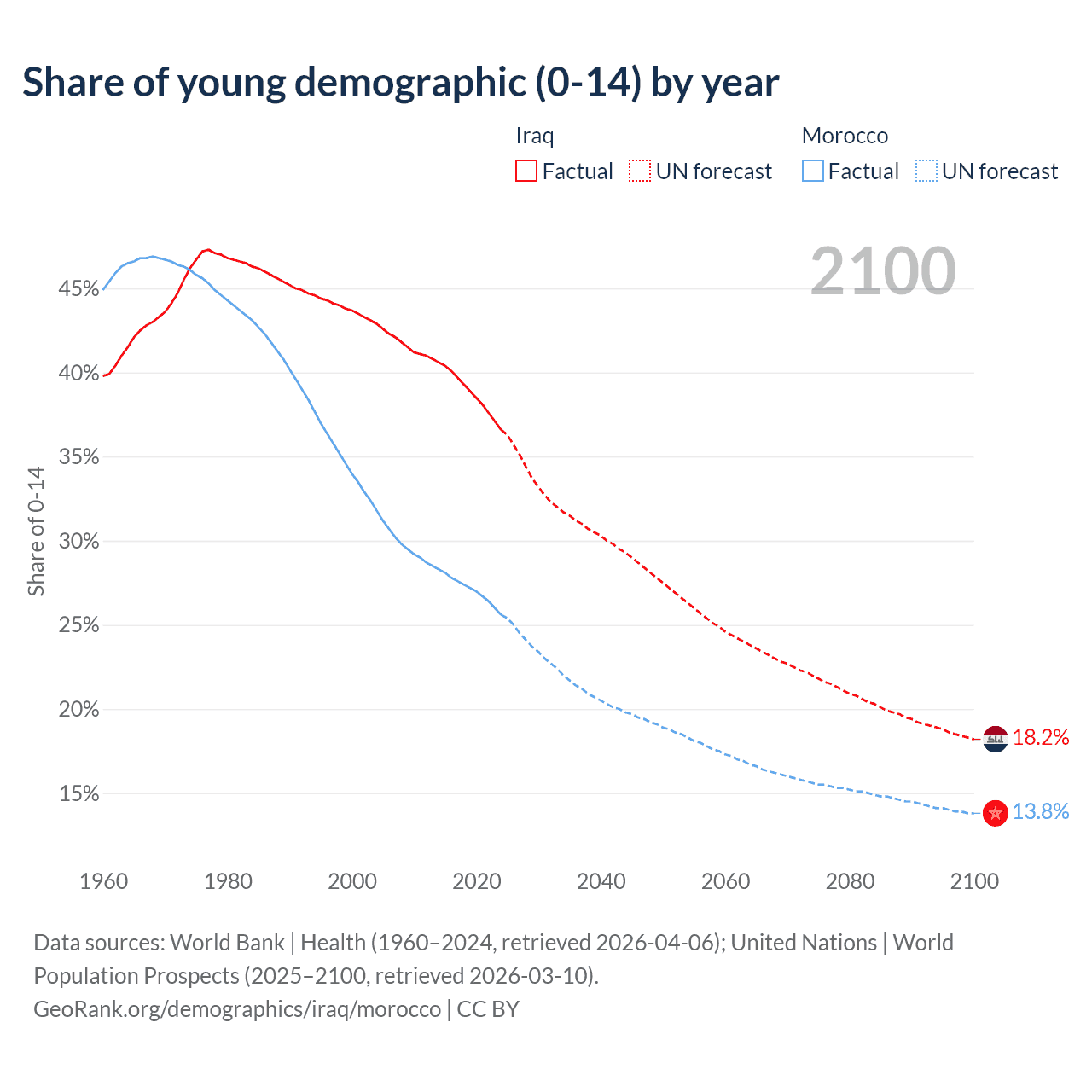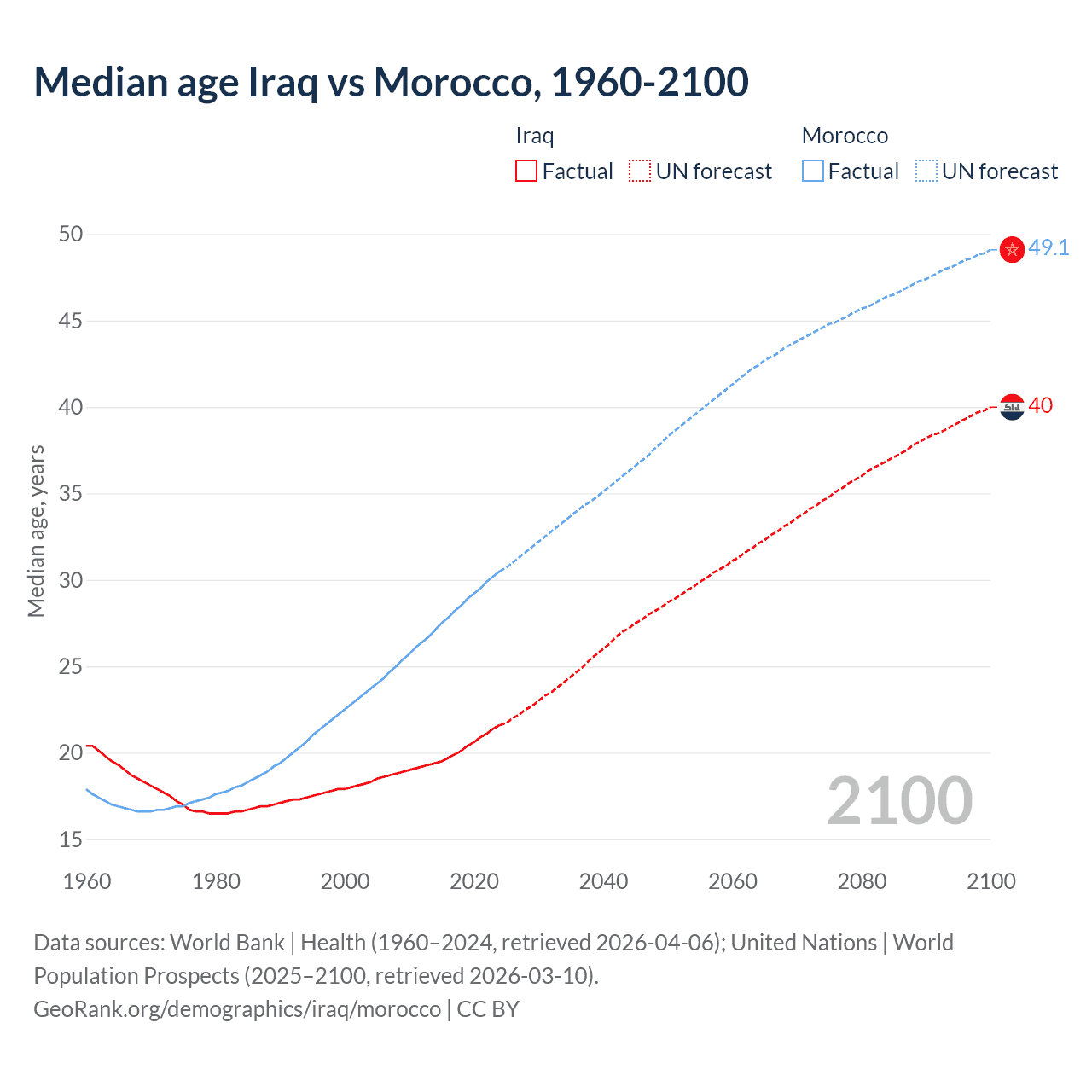 Median age Iraq vs Morocco, 1960-2100