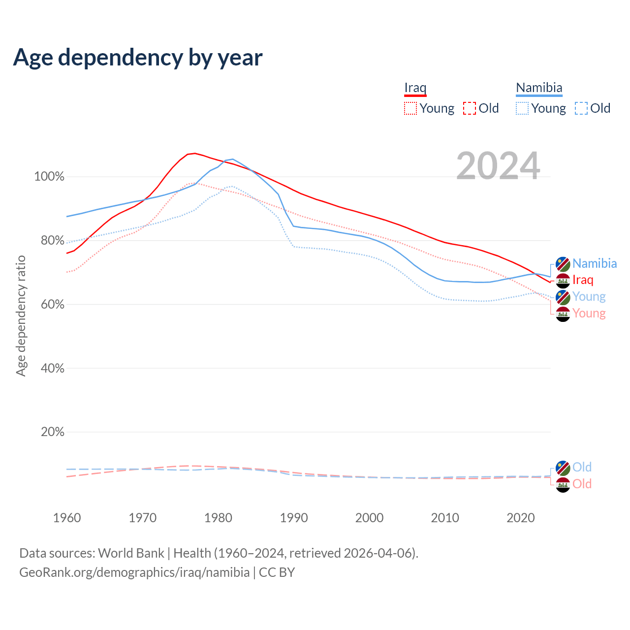 - The share of old-age demographic (65+) in Iraq is 3.41% vs 3.67% in Namibia.