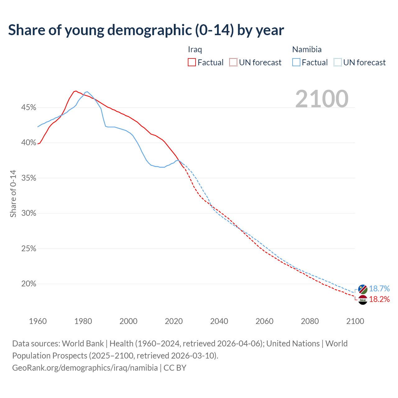 Median age Iraq vs Namibia, 1960-2100