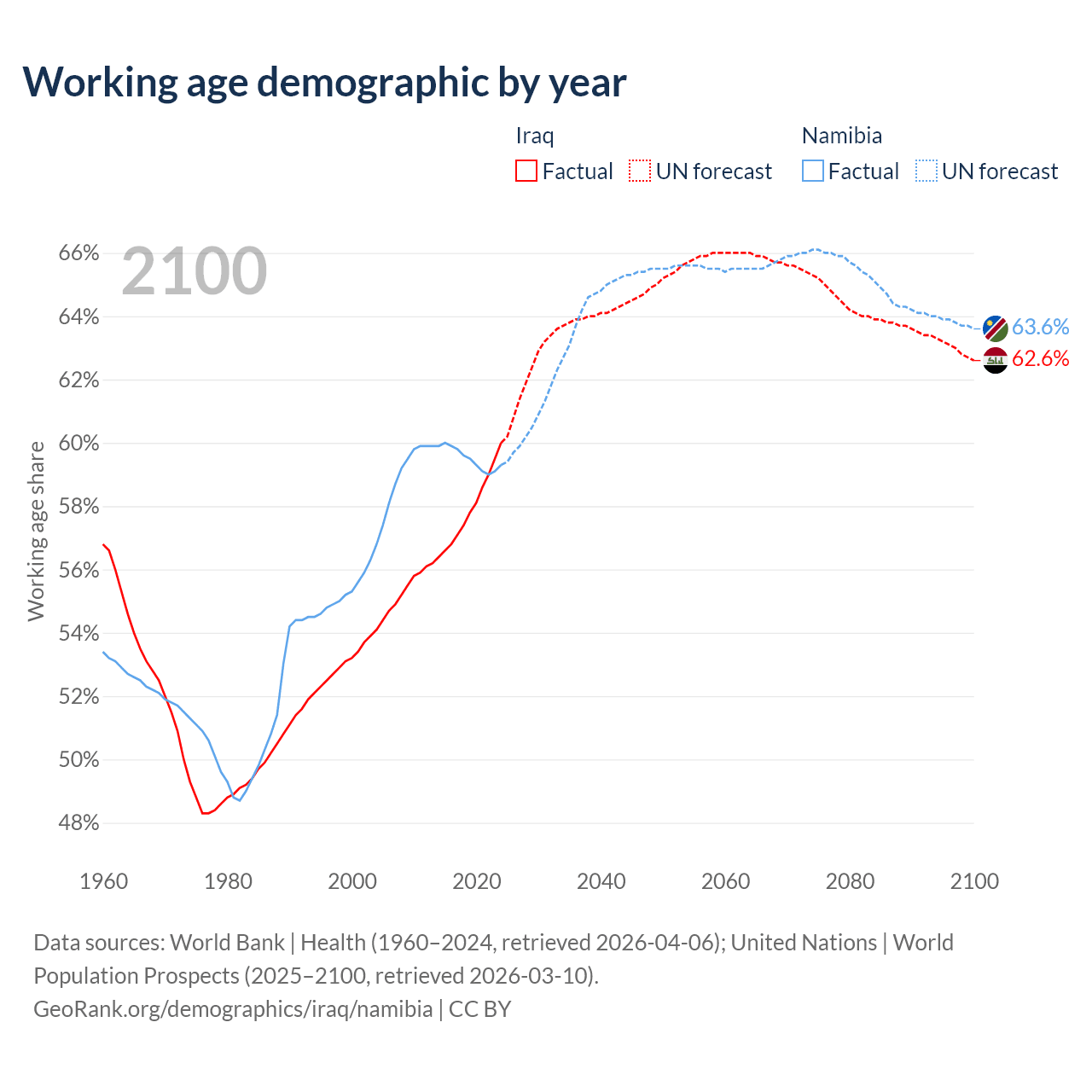 - Iraq has 29M working age adults (aged 15-64) vs 1.88M in Namibia.