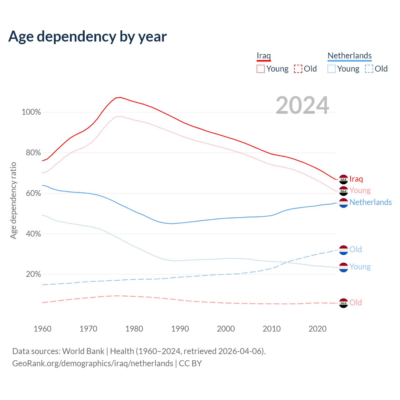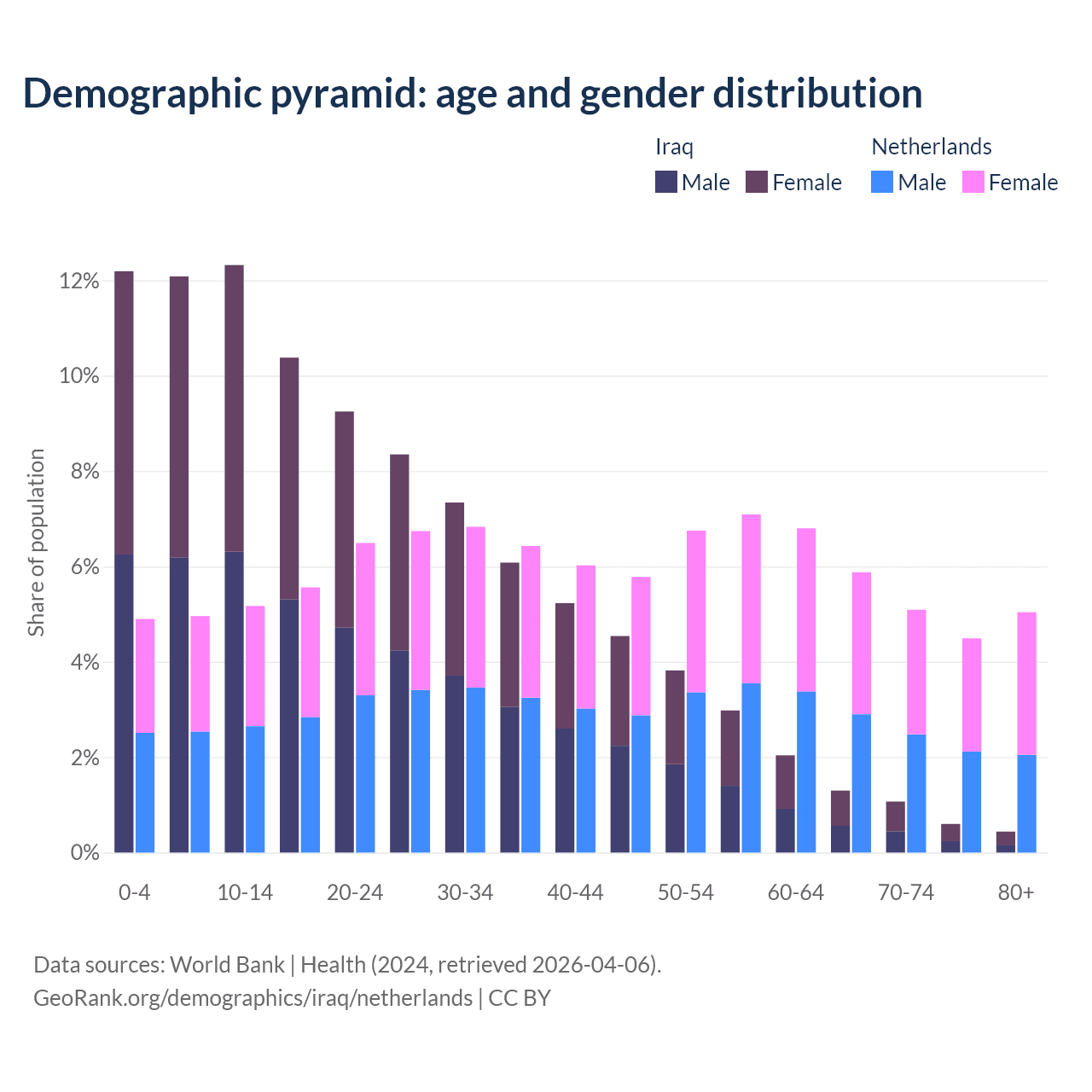 - Iraq is ranked 151/196 by median age (oldest to youngest) vs 33/196 for the Netherlands.