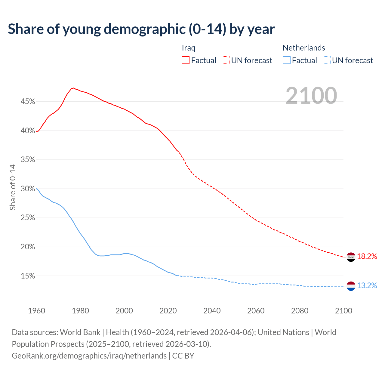 - The share of young demographic (0-15 years old) in Iraq is 36.6% vs 15% in the Netherlands.