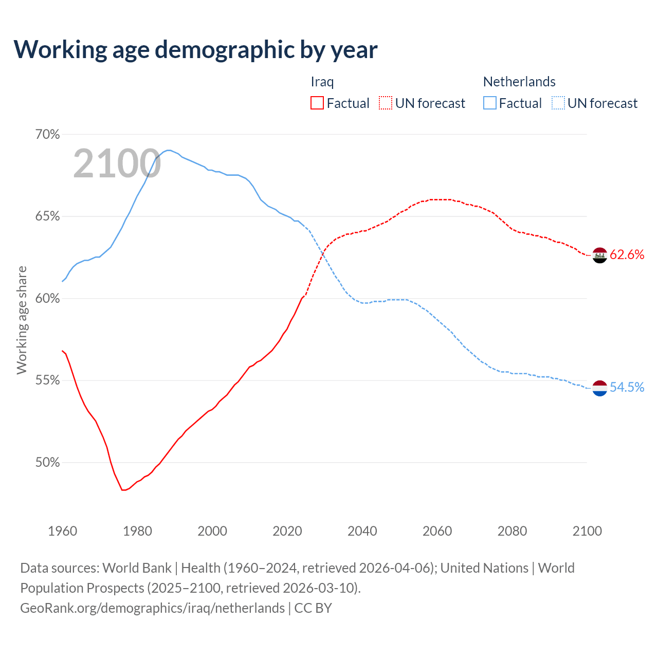 - Iraq has 29M working age adults (aged 15-64) vs 11.8M in the Netherlands.
