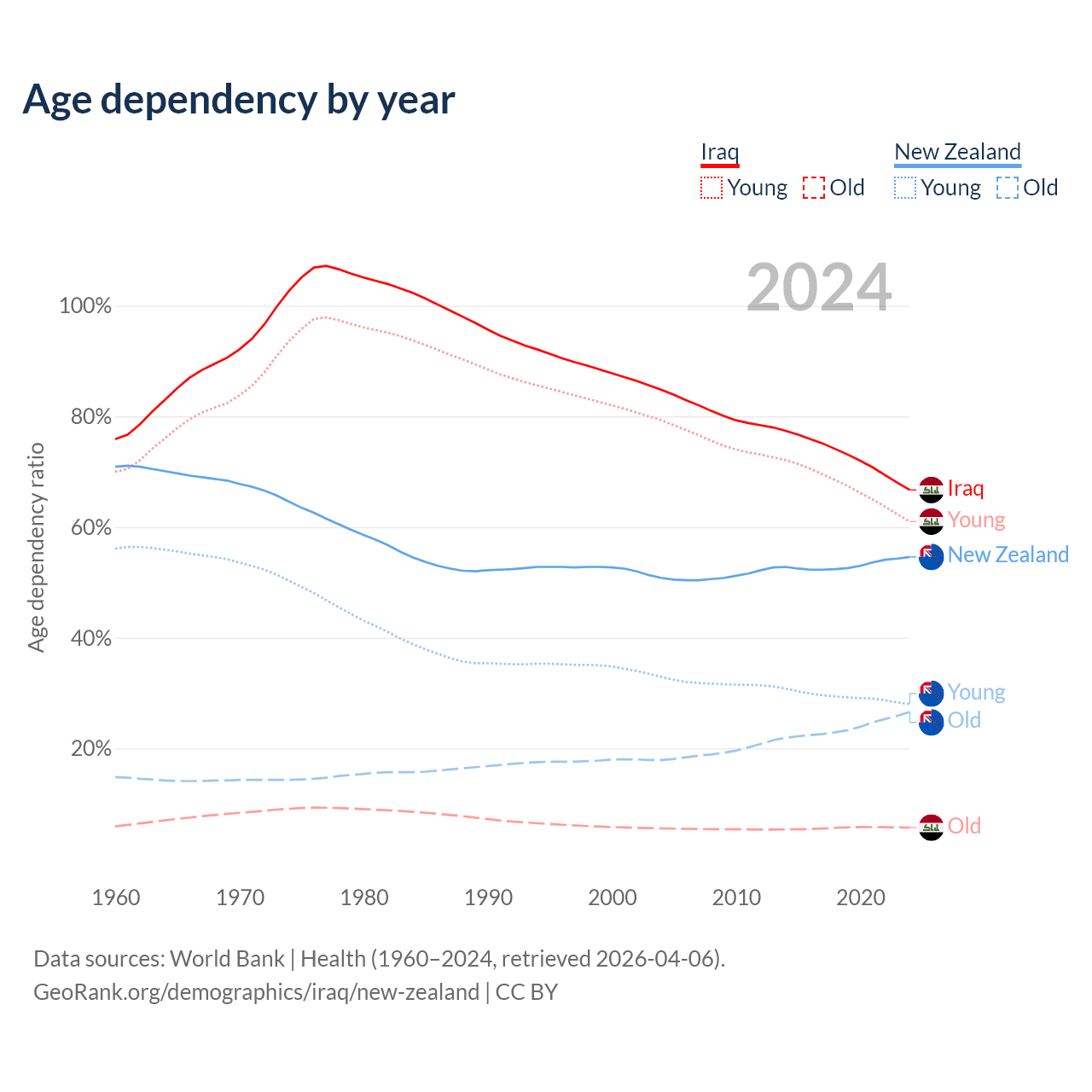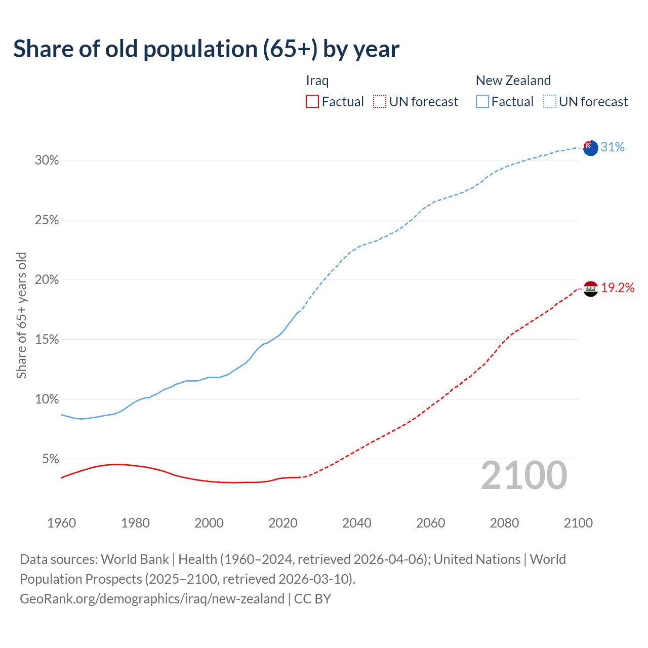- The share of old-age demographic (65+) in Iraq is 3.41% vs 17.2% in New Zealand.
