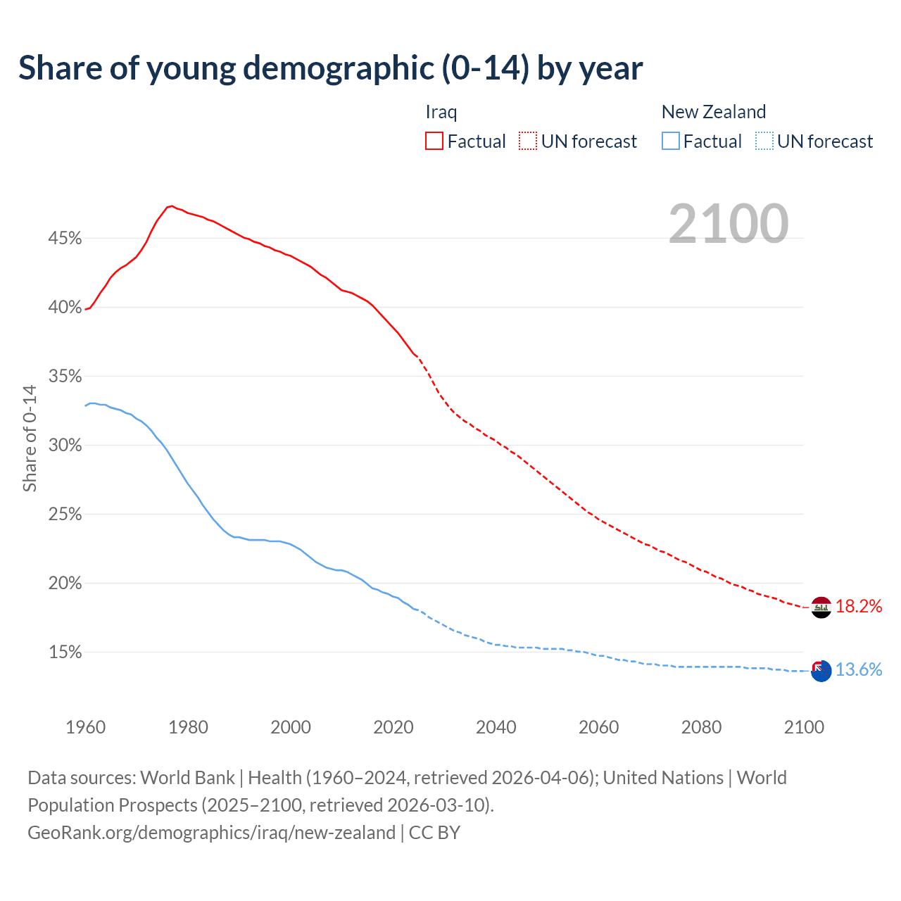 - The share of young demographic (0-15 years old) in Iraq is 36.6% vs 18.1% in New Zealand.
