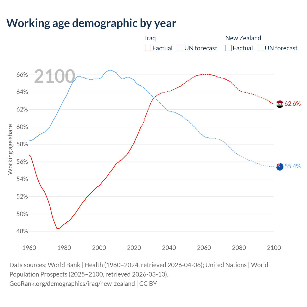 Median age Iraq vs New Zealand, 1960-2100
