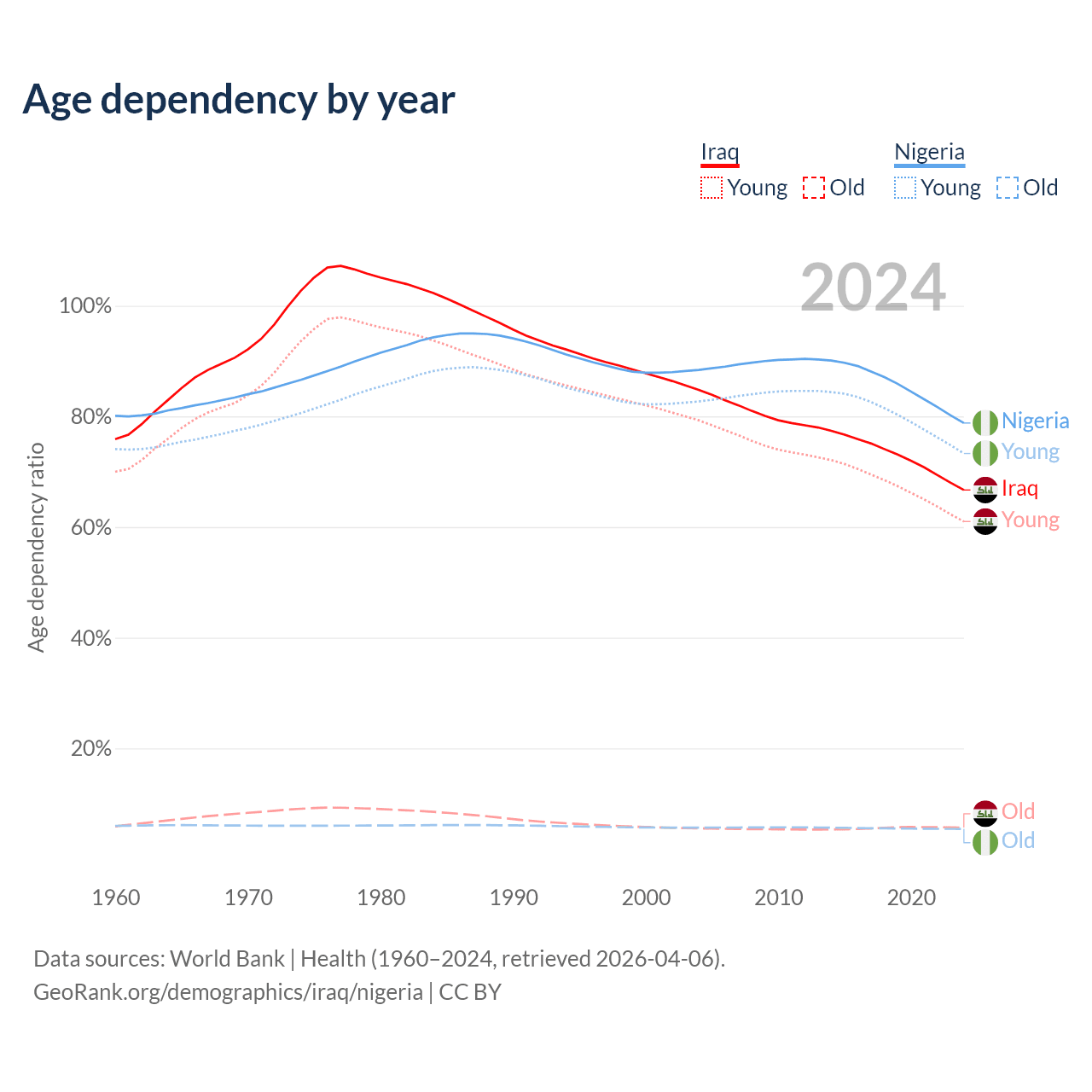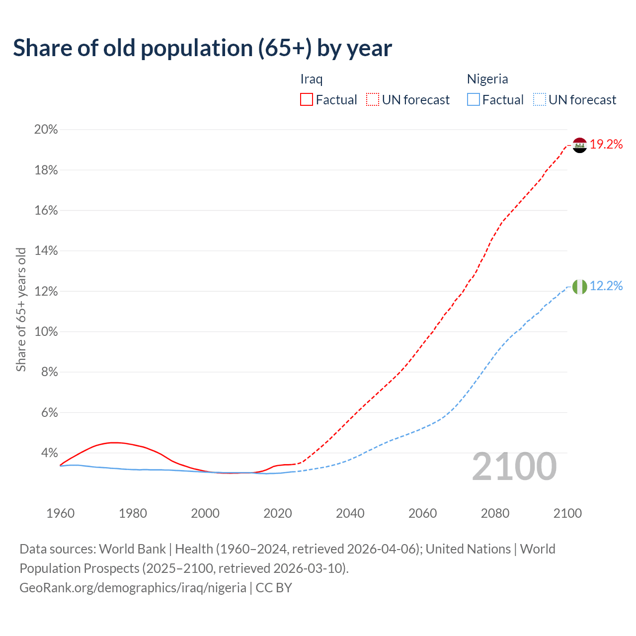 The share of older people aged 65 and over is 3.41% in Iraq and 3.05% in Nigeria. Life expectancy in Iraq compared to Nigeria .