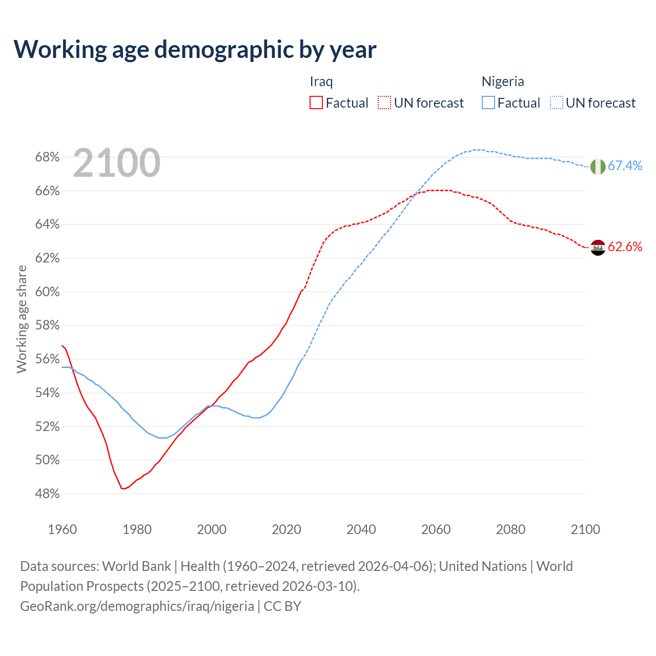 Median age Iraq vs Nigeria, 1960-2100