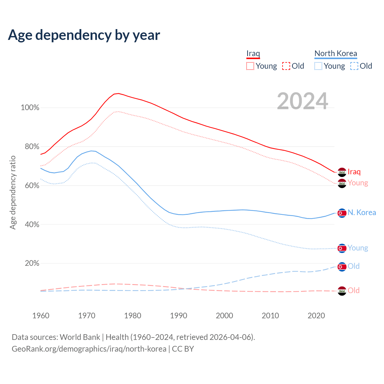 - The share of old-age demographic (65+) in Iraq is 3.41% vs 12.4% in North Korea.