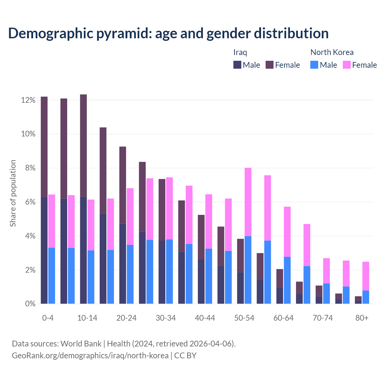 - Iraq is ranked 151/196 by median age (oldest to youngest) vs 62/196 for North Korea.