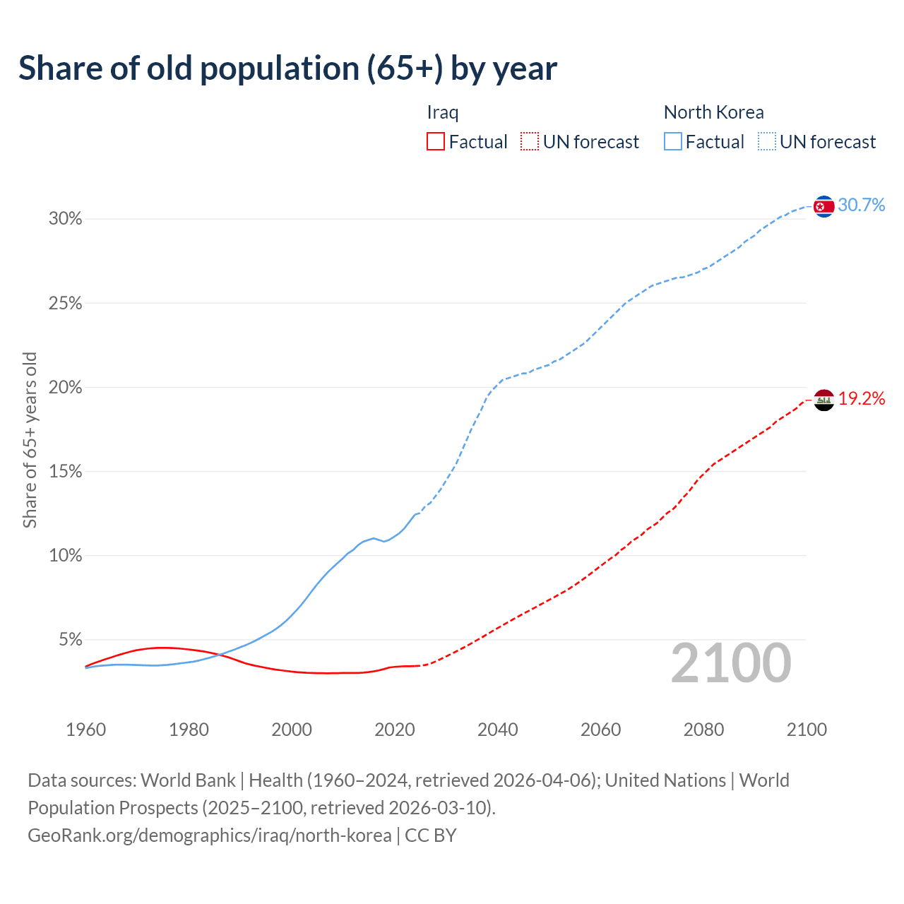 The share of older people aged 65 and over is 3.41% in Iraq and 12.4% in North Korea. Life expectancy in Iraq compared to North Korea .