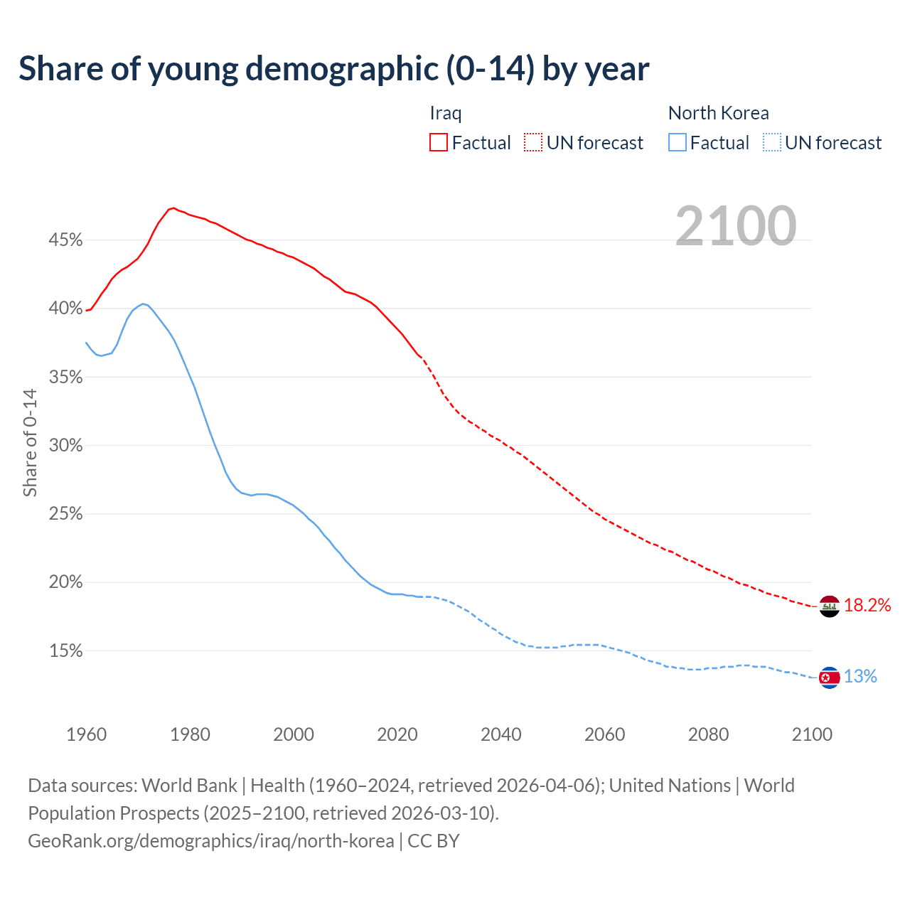 - The share of young demographic (0-15 years old) in Iraq is 36.6% vs 18.9% in North Korea.