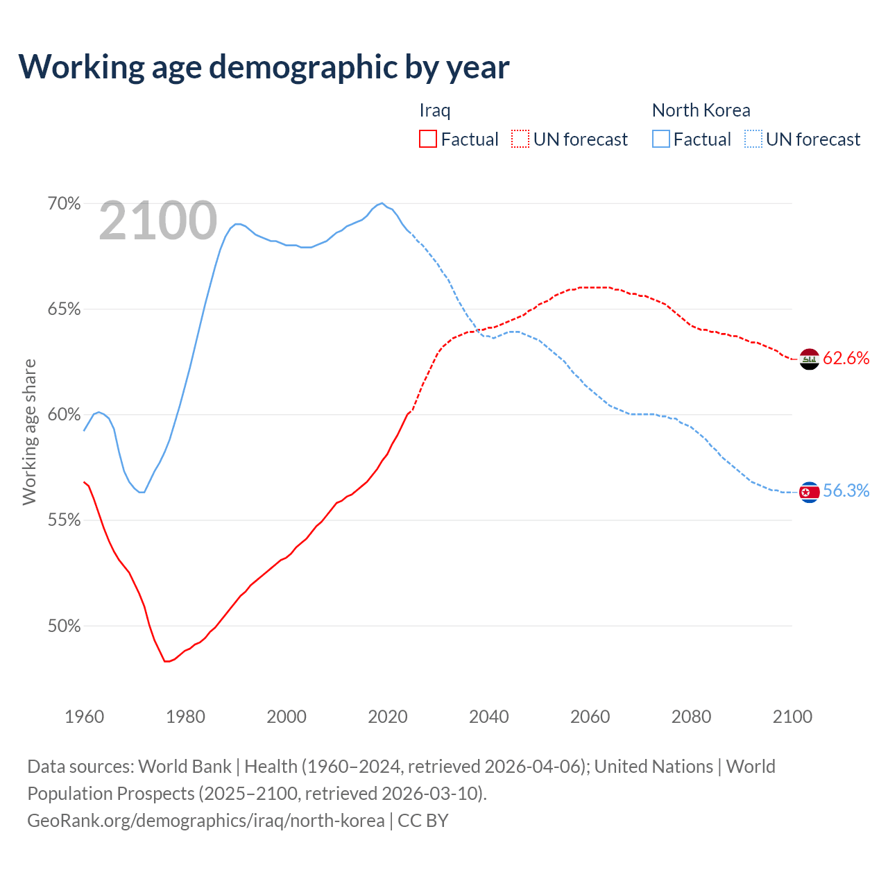 - Iraq has 29M working age adults (aged 15-64) vs 18.3M in North Korea.