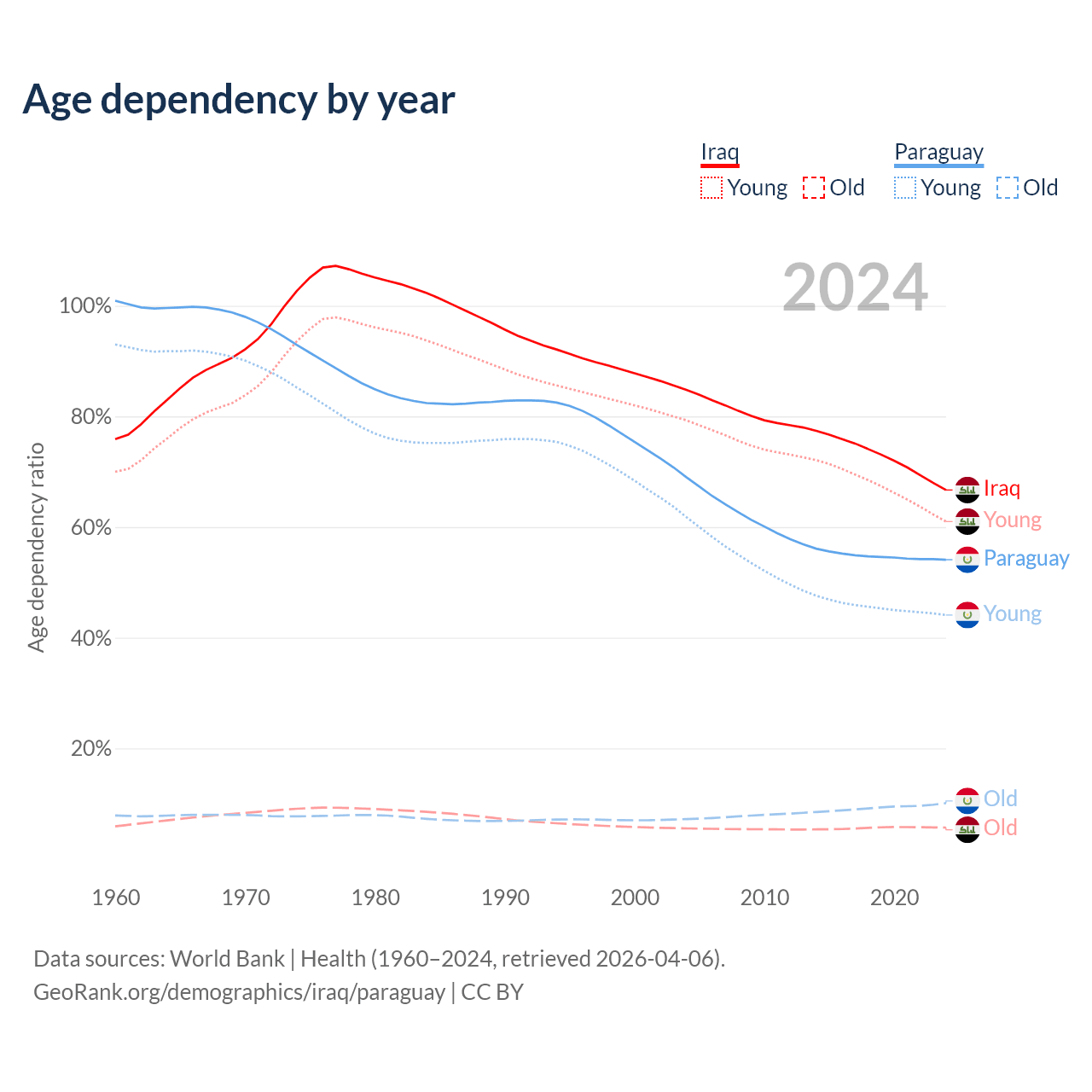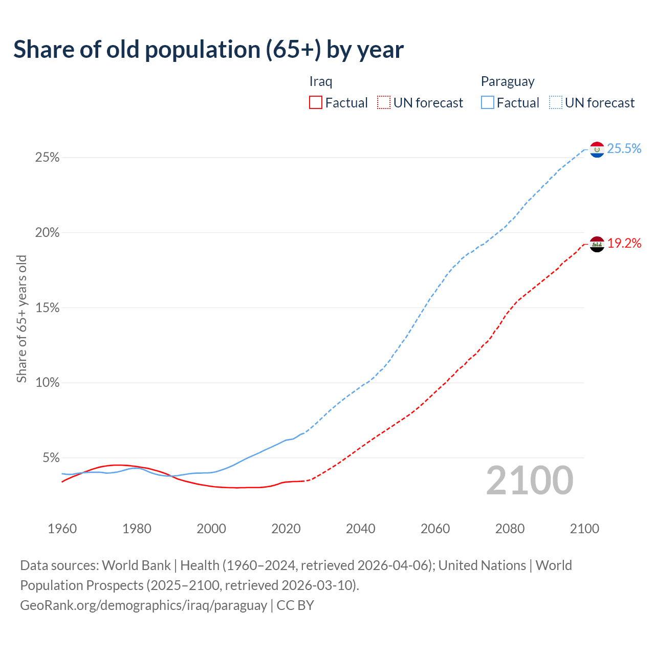 The share of older people aged 65 and over is 3.41% in Iraq and 6.54% in Paraguay. Life expectancy in Iraq compared to Paraguay .