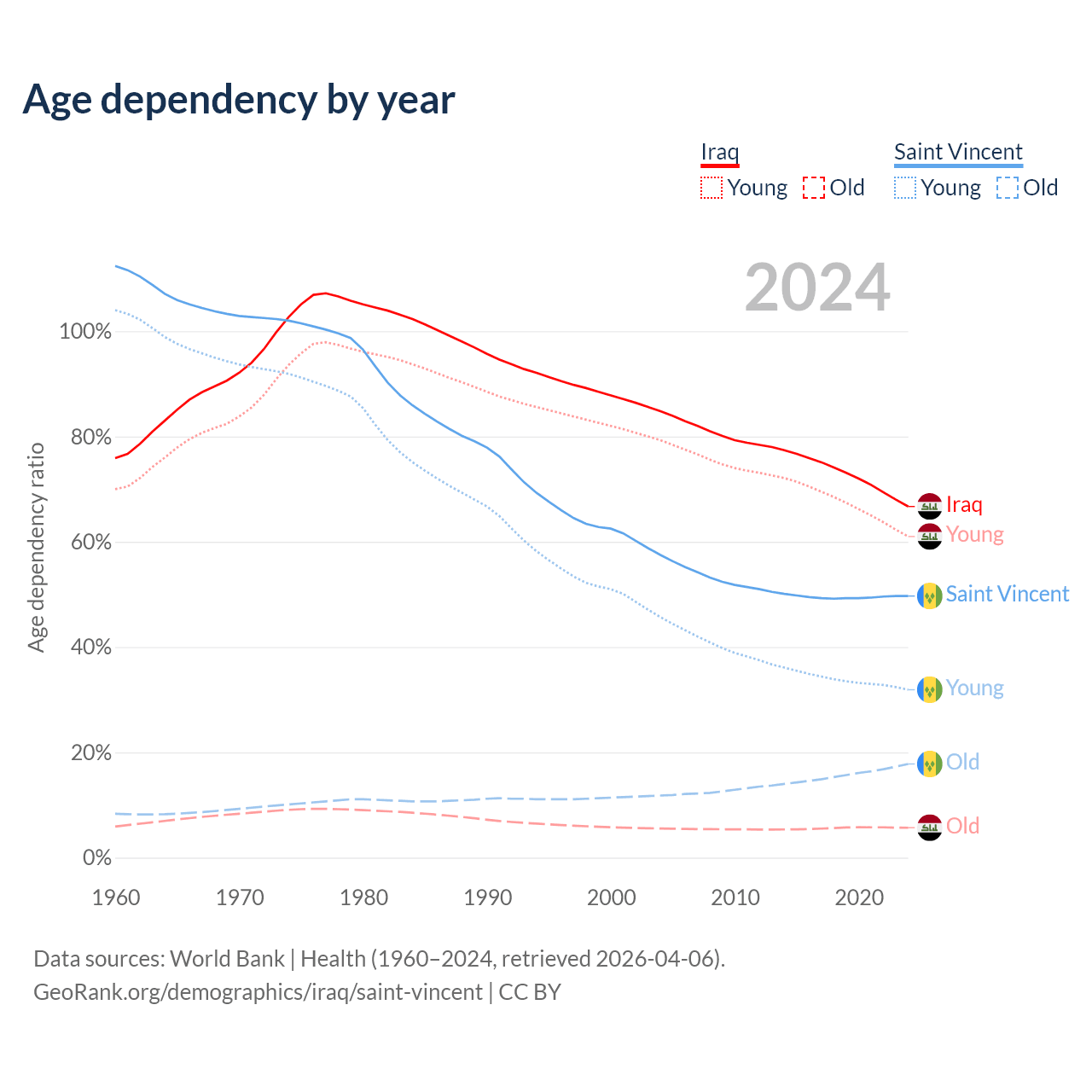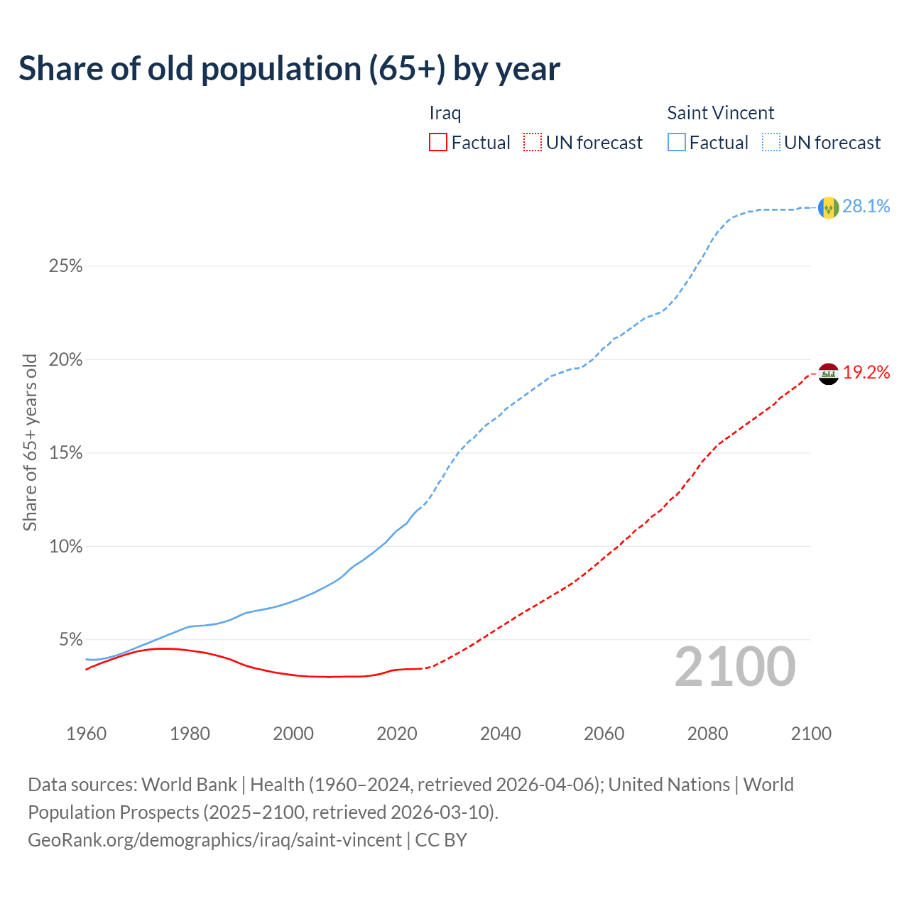 - The share of old-age demographic (65+) in Iraq is 3.41% vs 11.9% in Saint Vincent.