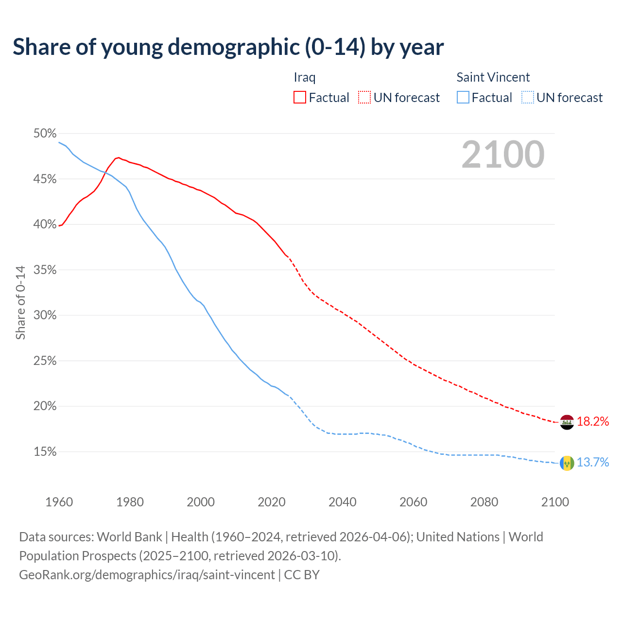 - The share of young demographic (0-15 years old) in Iraq is 36.6% vs 21.3% in Saint Vincent.