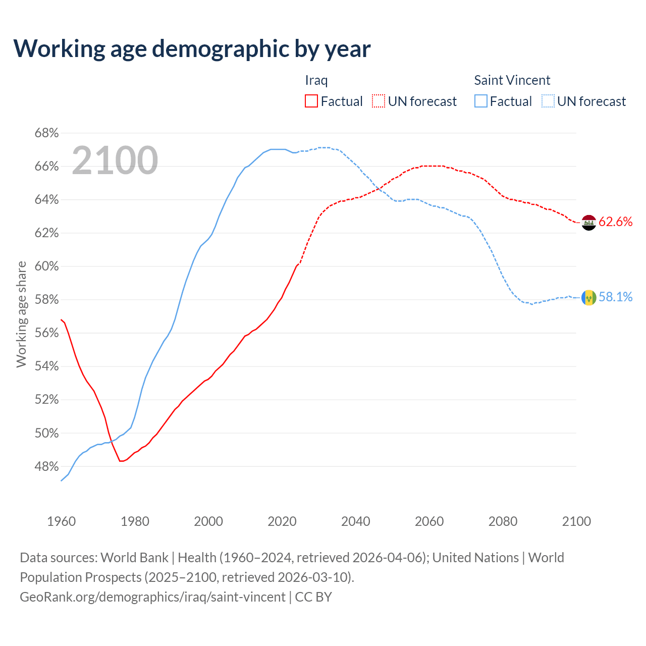 - Iraq has 29M working age adults (aged 15-64) vs 66.3K in Saint Vincent.
