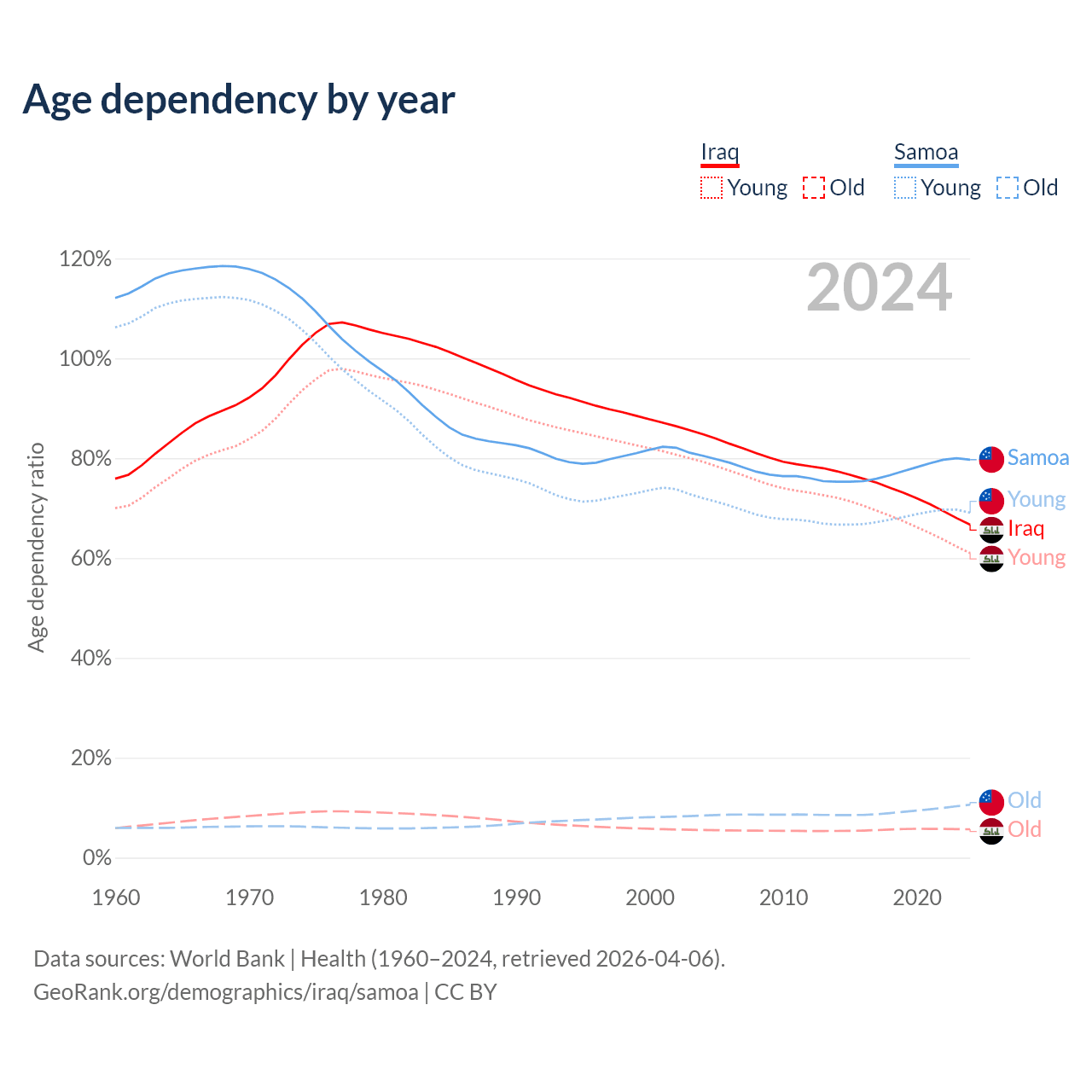 - The share of old-age demographic (65+) in Iraq is 3.41% vs 5.88% in Samoa.