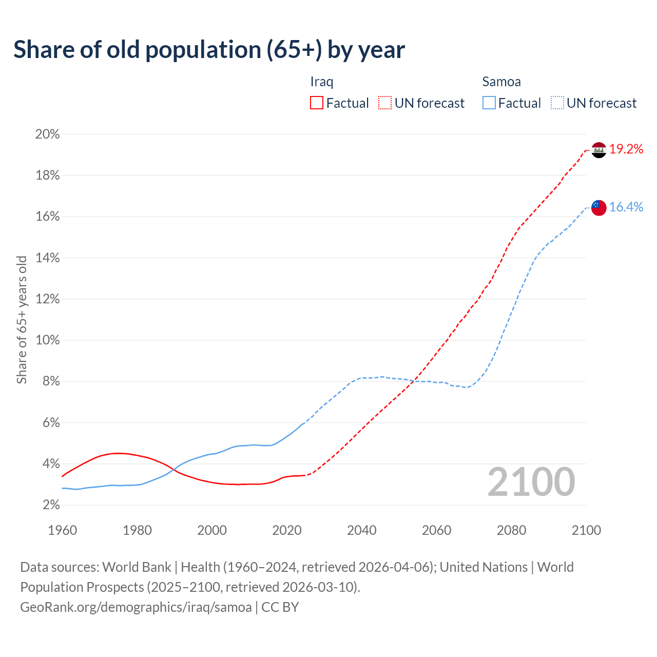 The share of older people aged 65 and over is 3.41% in Iraq and 5.88% in Samoa. Life expectancy in Iraq compared to Samoa .
