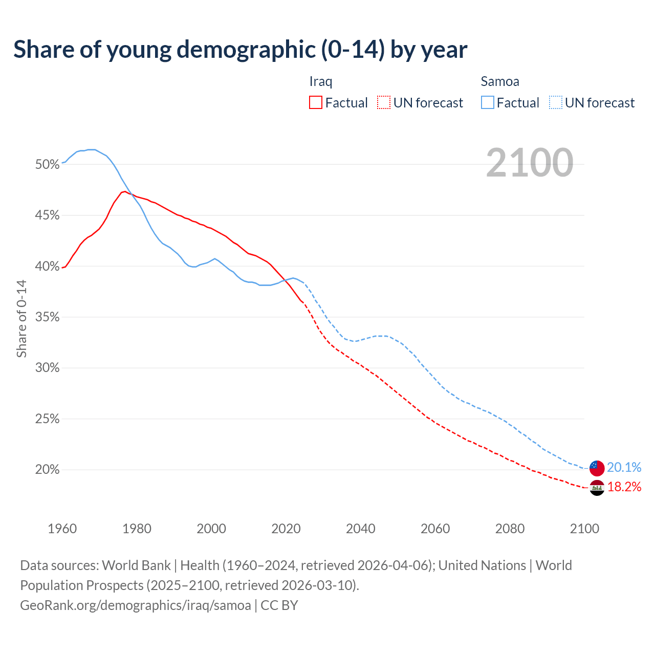 - The share of young demographic (0-15 years old) in Iraq is 36.6% vs 38.5% in Samoa.
