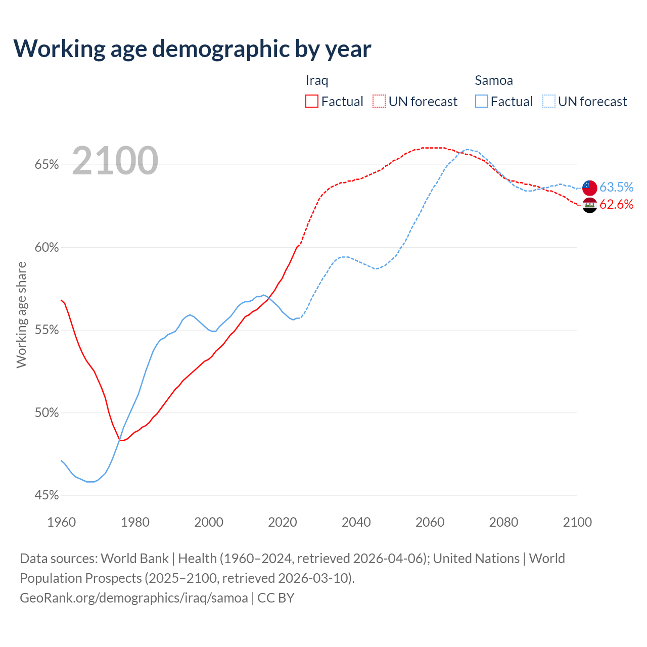 - Iraq has 29M working age adults (aged 15-64) vs 123K in Samoa.