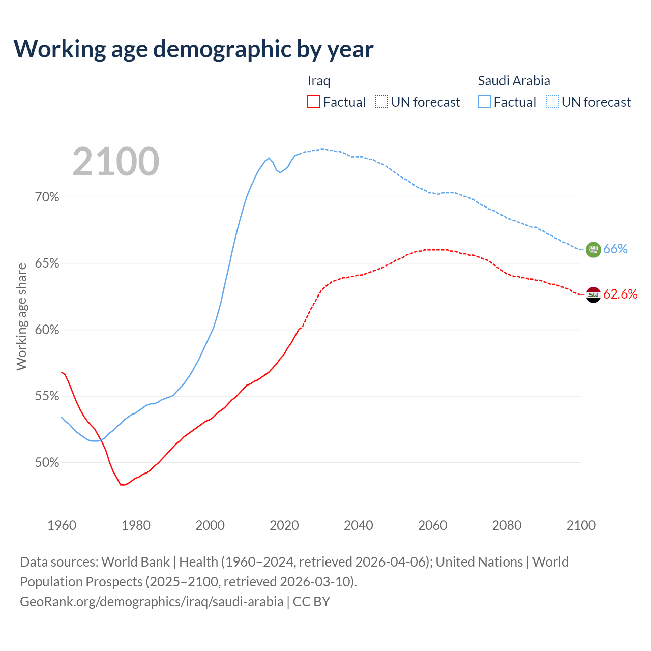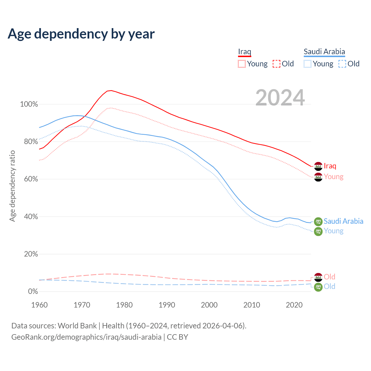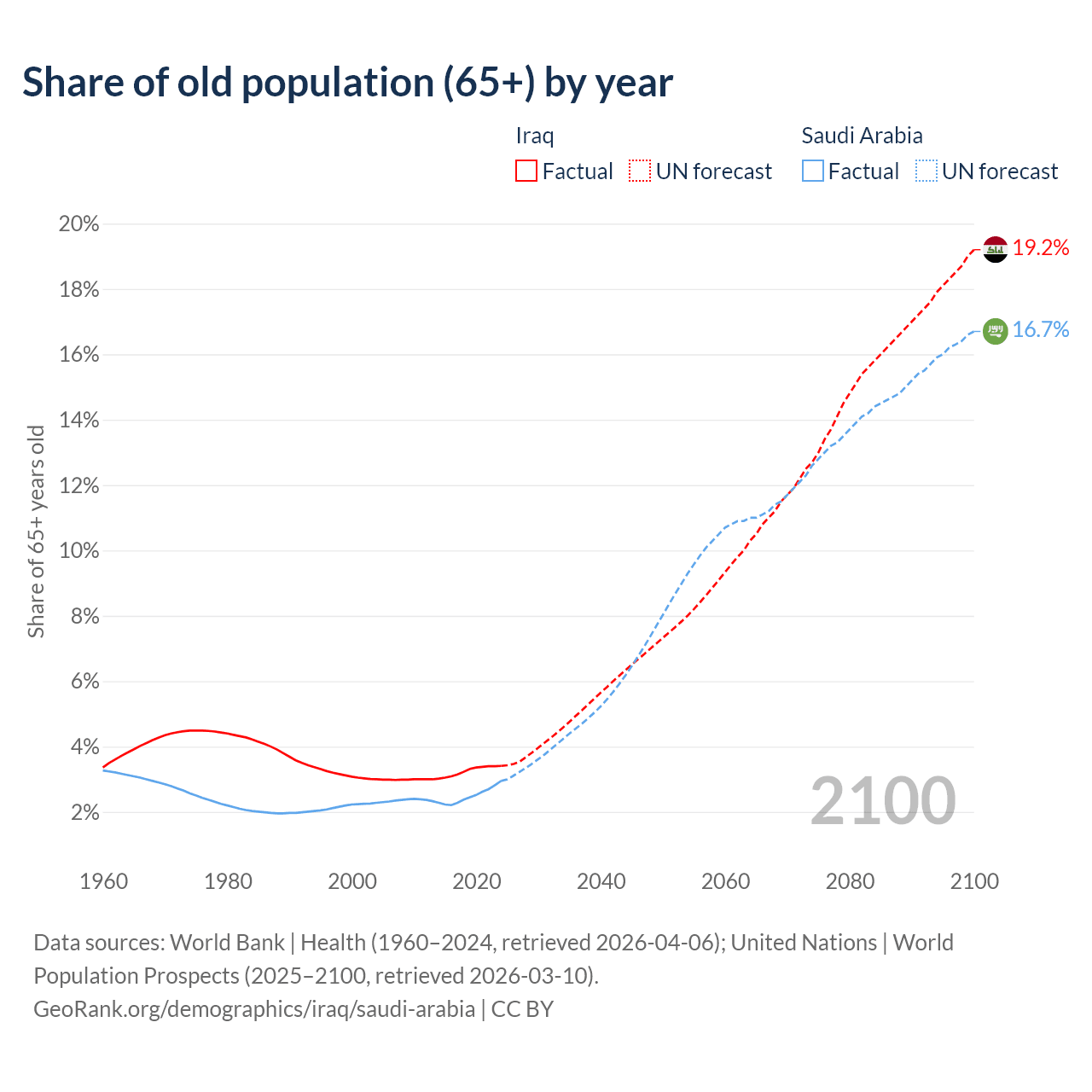 The share of older people aged 65 and over is 3.41% in Iraq and 2.95% in Saudi Arabia. Life expectancy in Iraq compared to Saudi Arabia .
