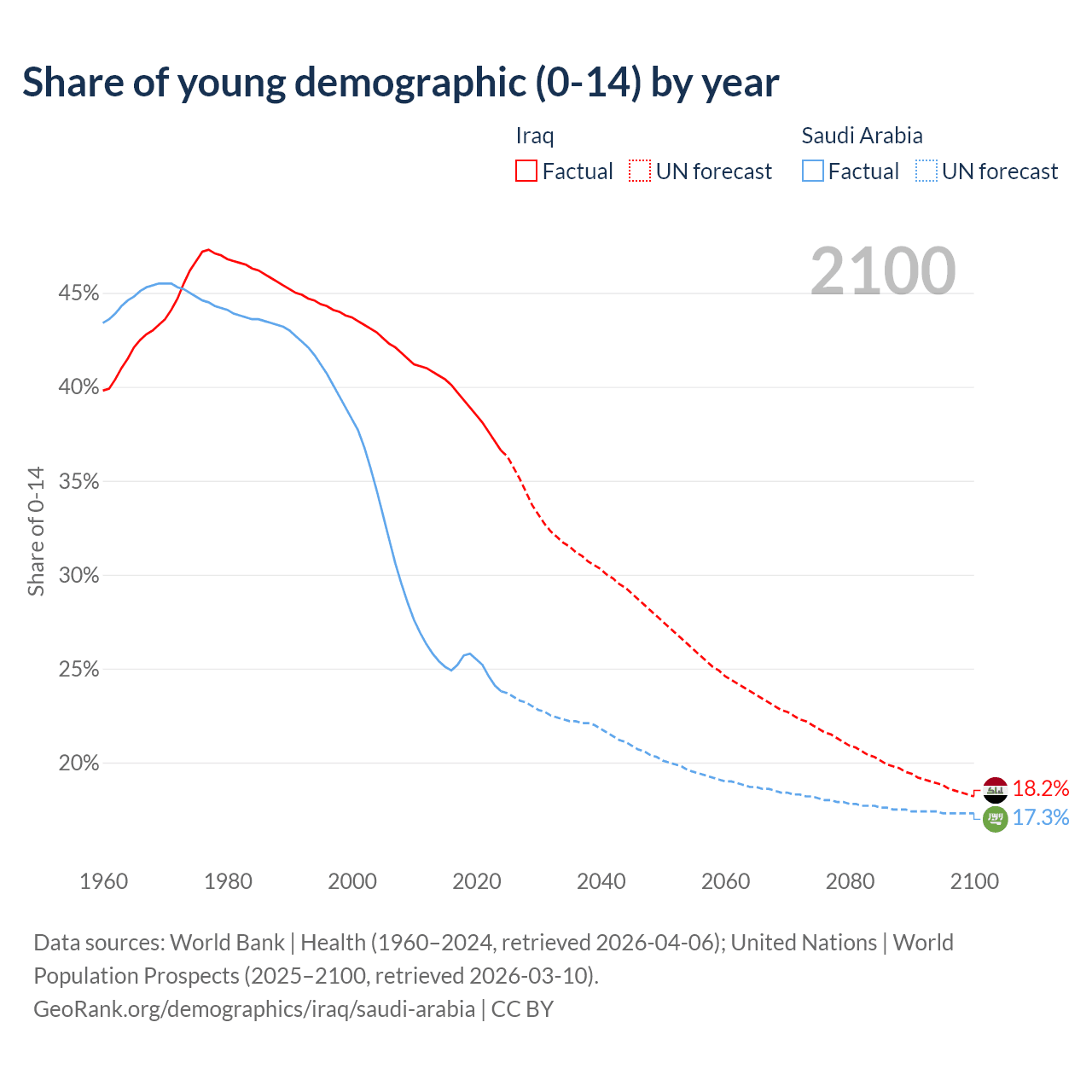 Median age Iraq vs Saudi Arabia, 1960-2100