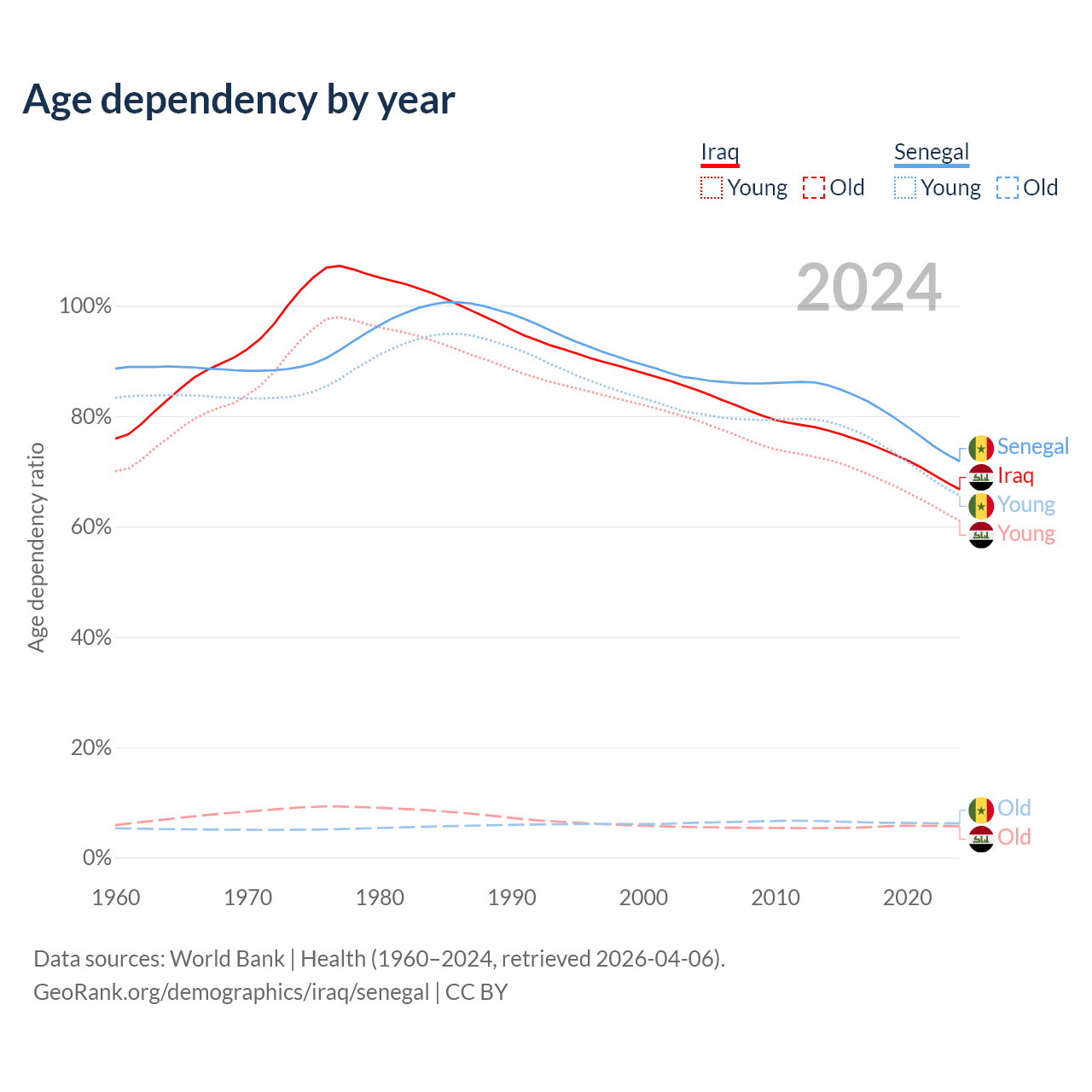 - The share of old-age demographic (65+) in Iraq is 3.41% vs 3.62% in Senegal.