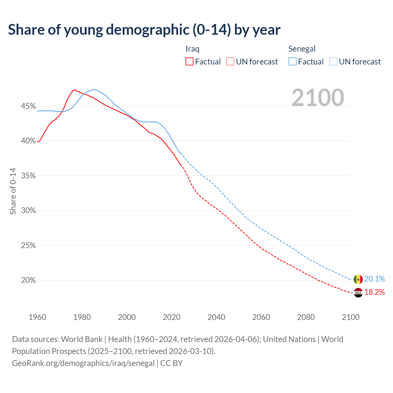 - The share of young demographic (0-15 years old) in Iraq is 36.6% vs 38.2% in Senegal.