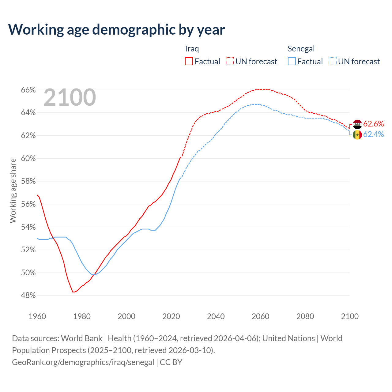 - Iraq has 29M working age adults (aged 15-64) vs 11.3M in Senegal.
