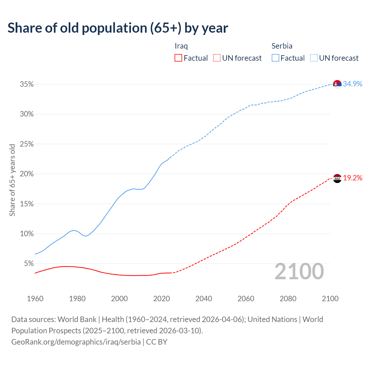 The share of older people aged 65 and over is 3.41% in Iraq and 22.7% in Serbia. Life expectancy in Iraq compared to Serbia .