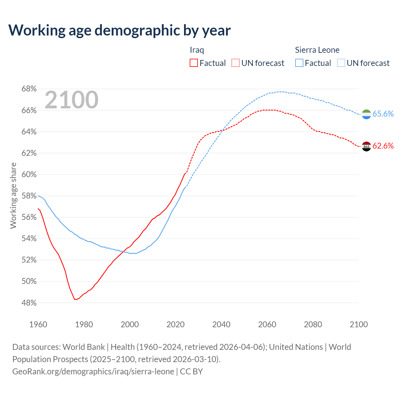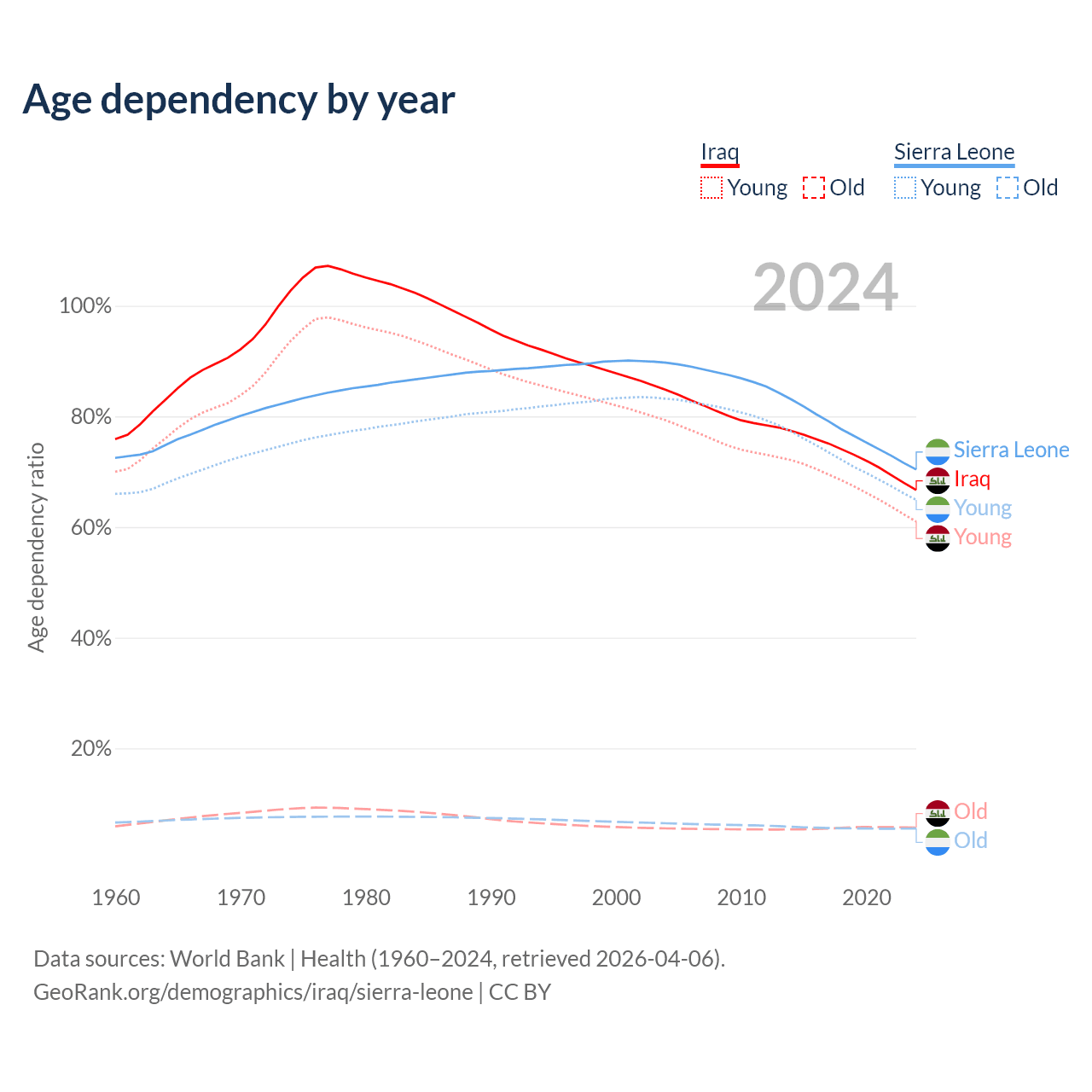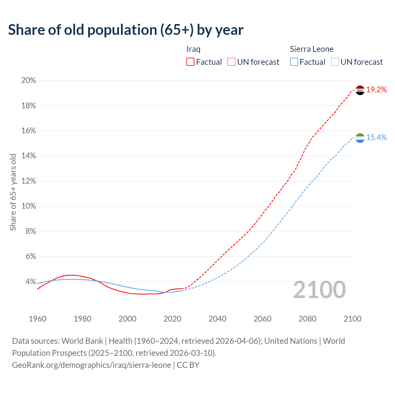 The share of older people aged 65 and over is 3.41% in Iraq and 3.24% in Sierra Leone. Life expectancy in Iraq compared to Sierra Leone .