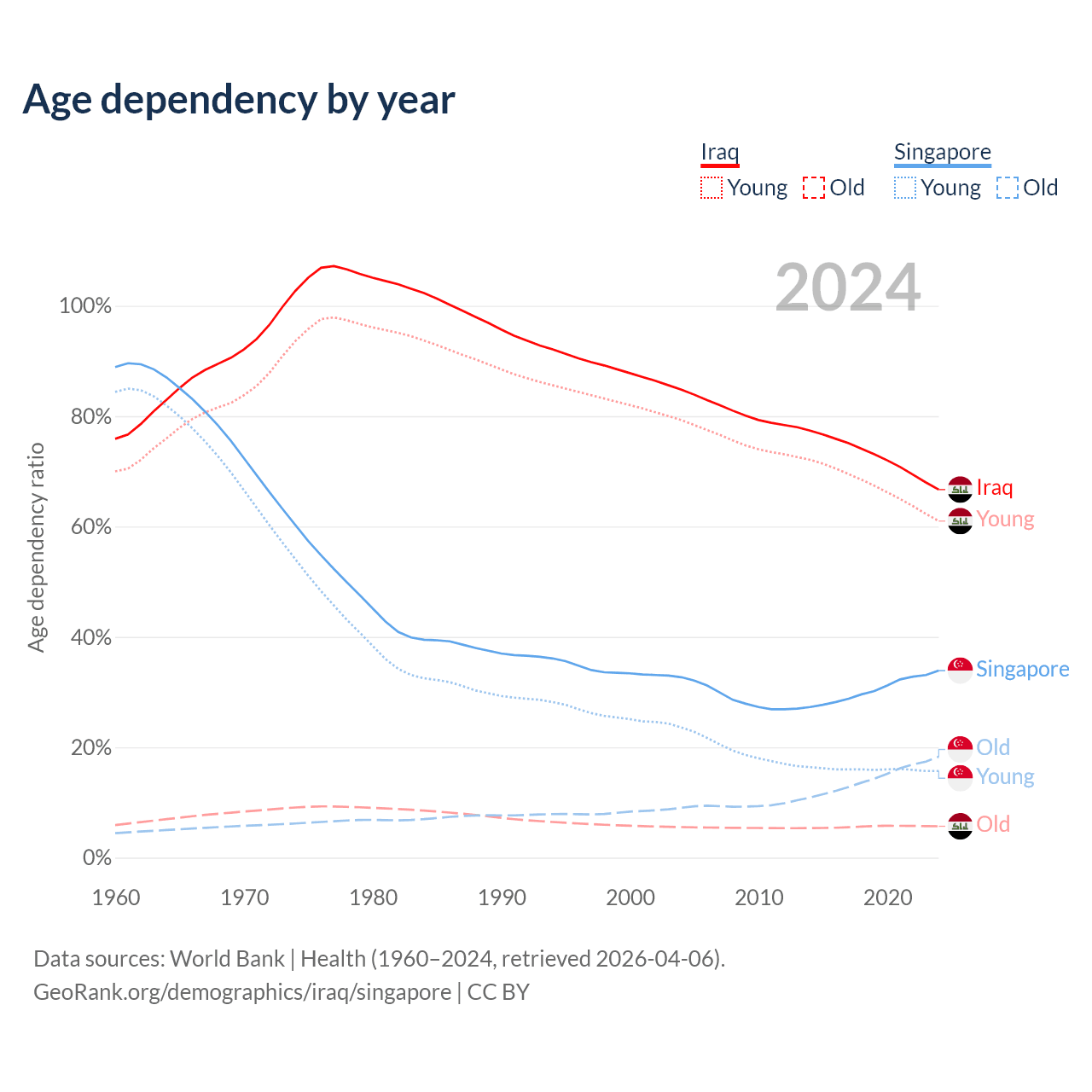 - Iraq is ranked 151/196 by median age (oldest to youngest) vs 68/196 for Singapore.
