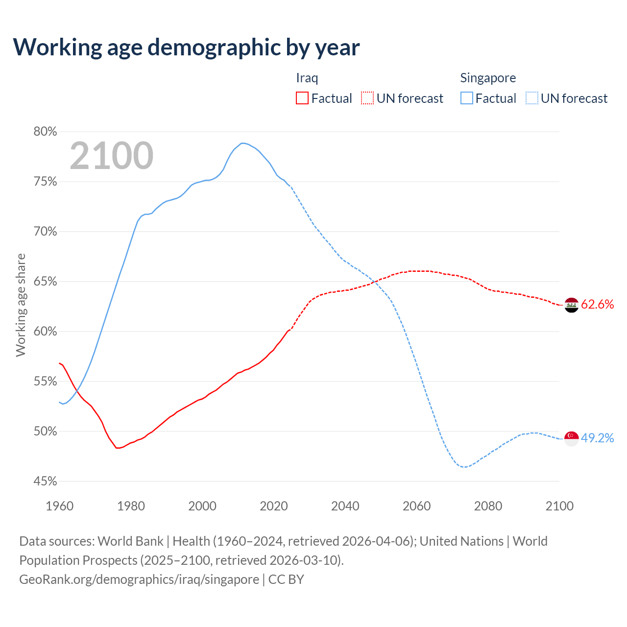 Median age Iraq vs Singapore, 1960-2100
