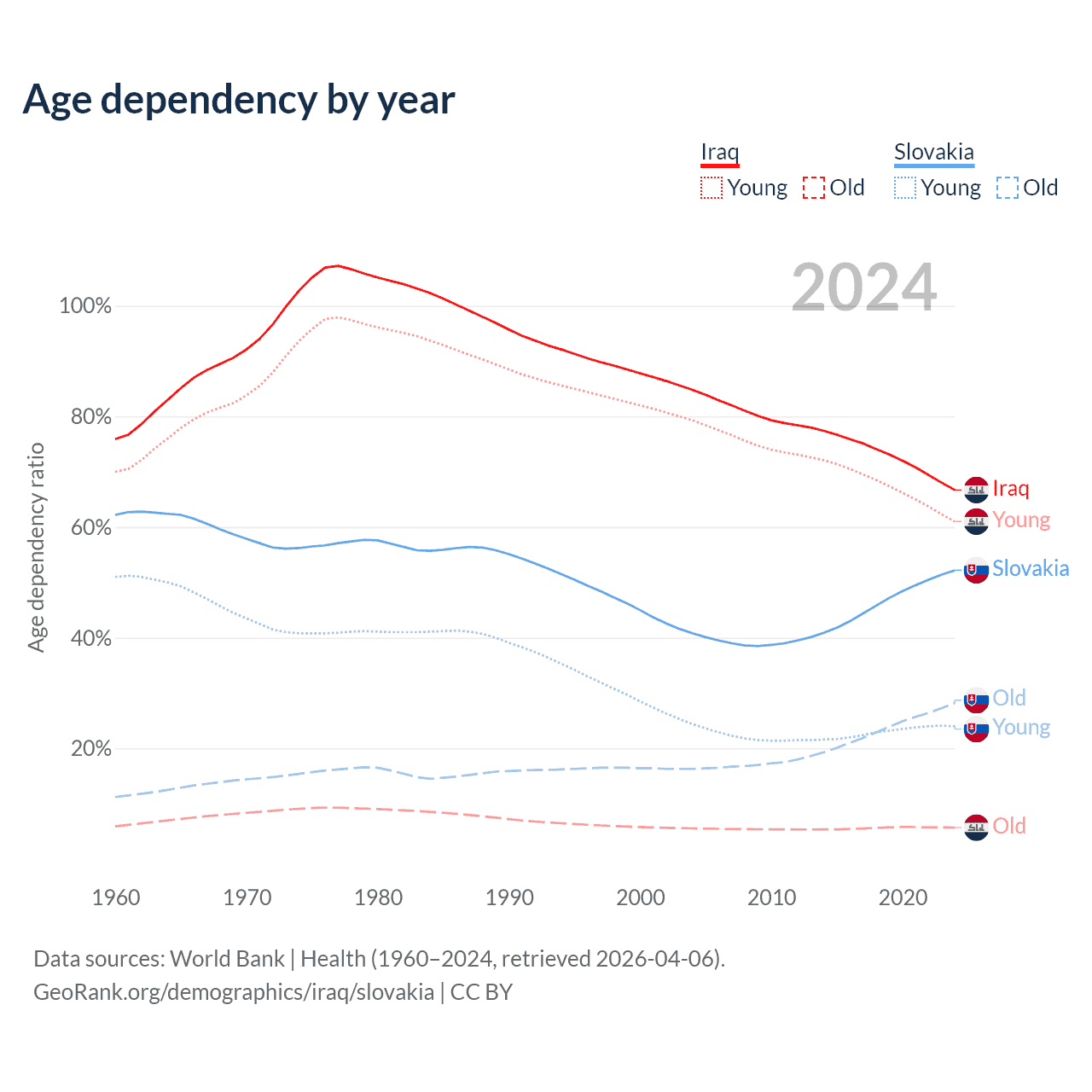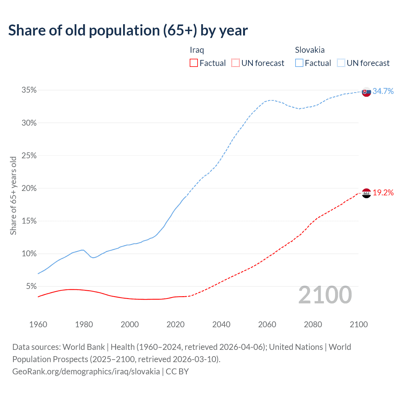 The share of older people aged 65 and over is 3.41% in Iraq and 18.5% in Slovakia. Life expectancy in Iraq compared to Slovakia .