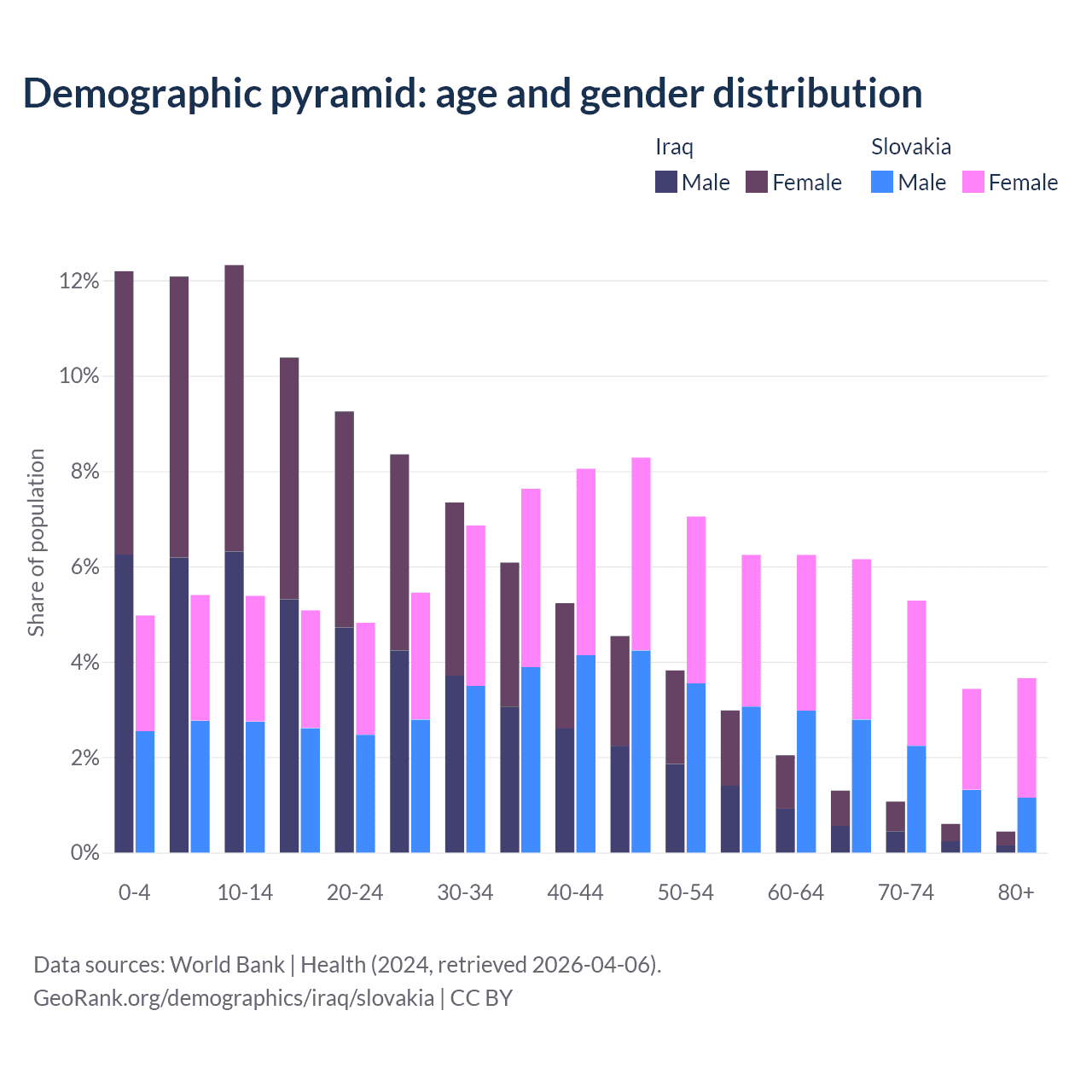 - Iraq is ranked 151/196 by median age (oldest to youngest) vs 31/196 for Slovakia.