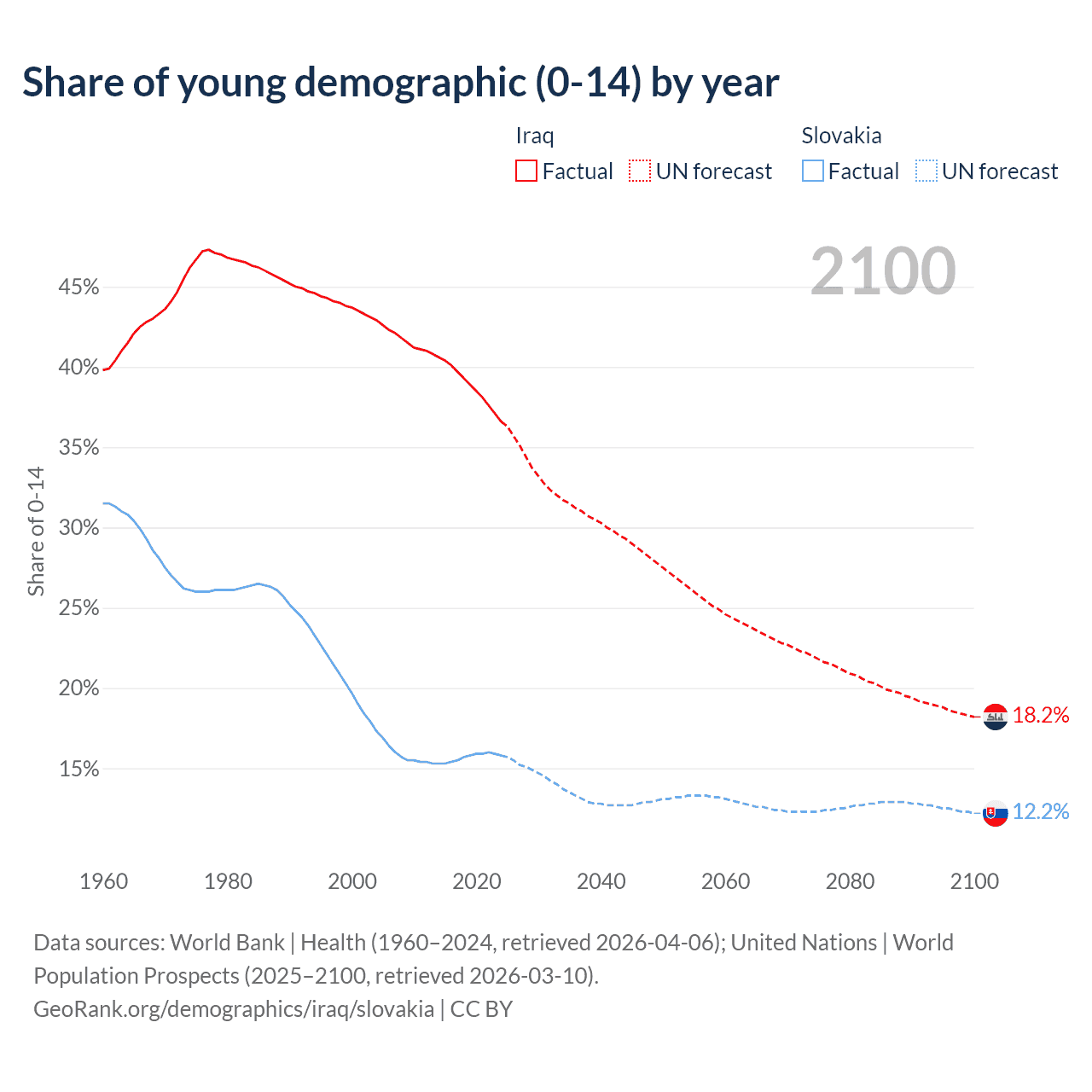 - The share of young demographic (0-15 years old) in Iraq is 36.6% vs 15.8% in Slovakia.