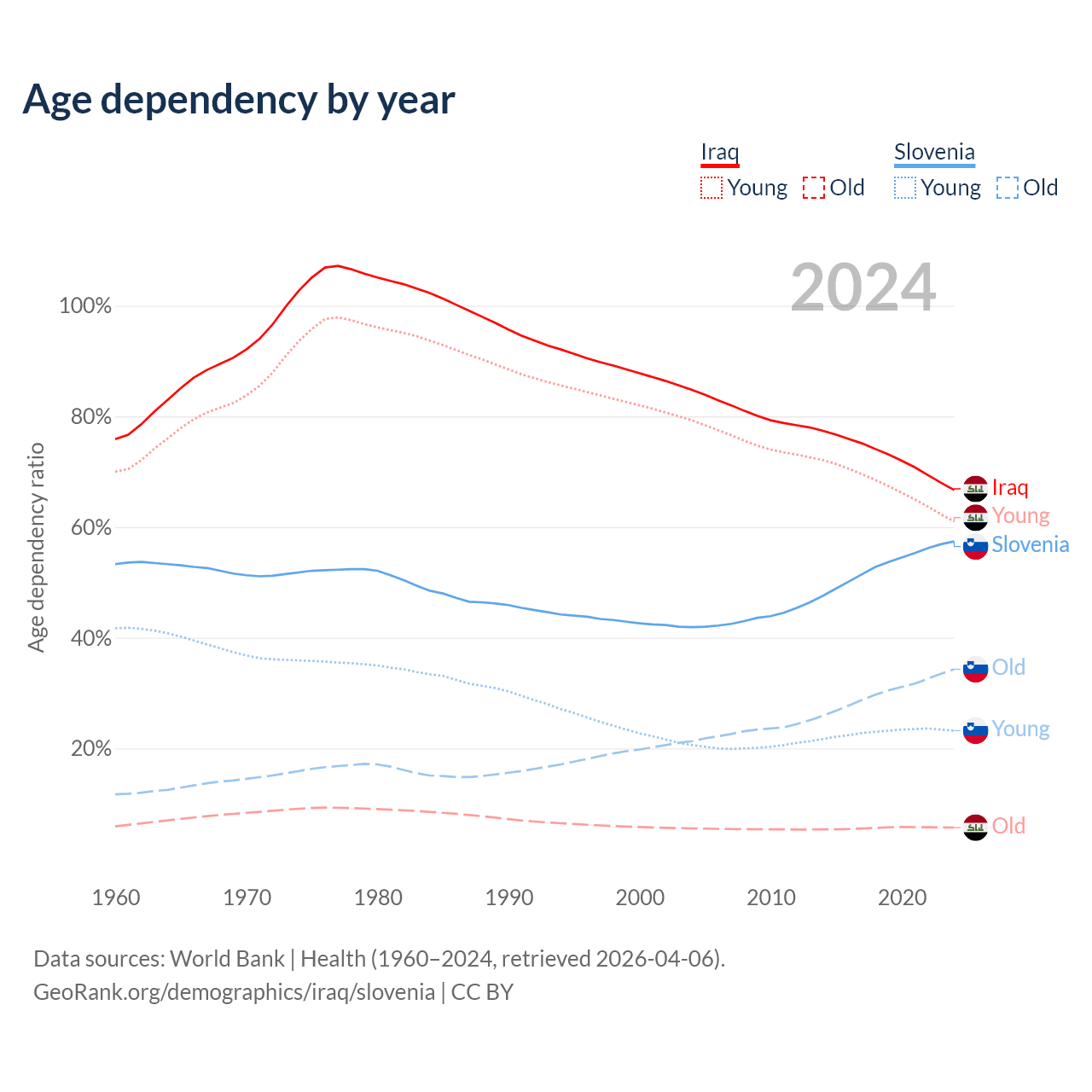 - The share of old-age demographic (65+) in Iraq is 3.41% vs 21.8% in Slovenia.