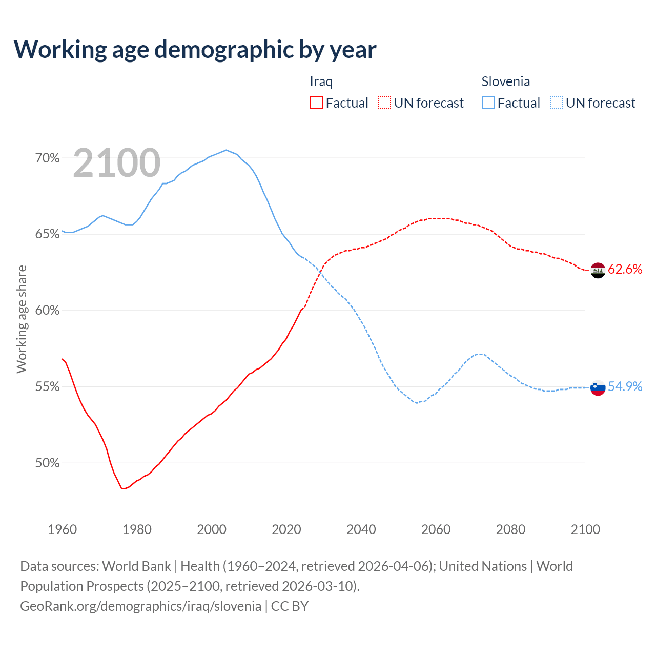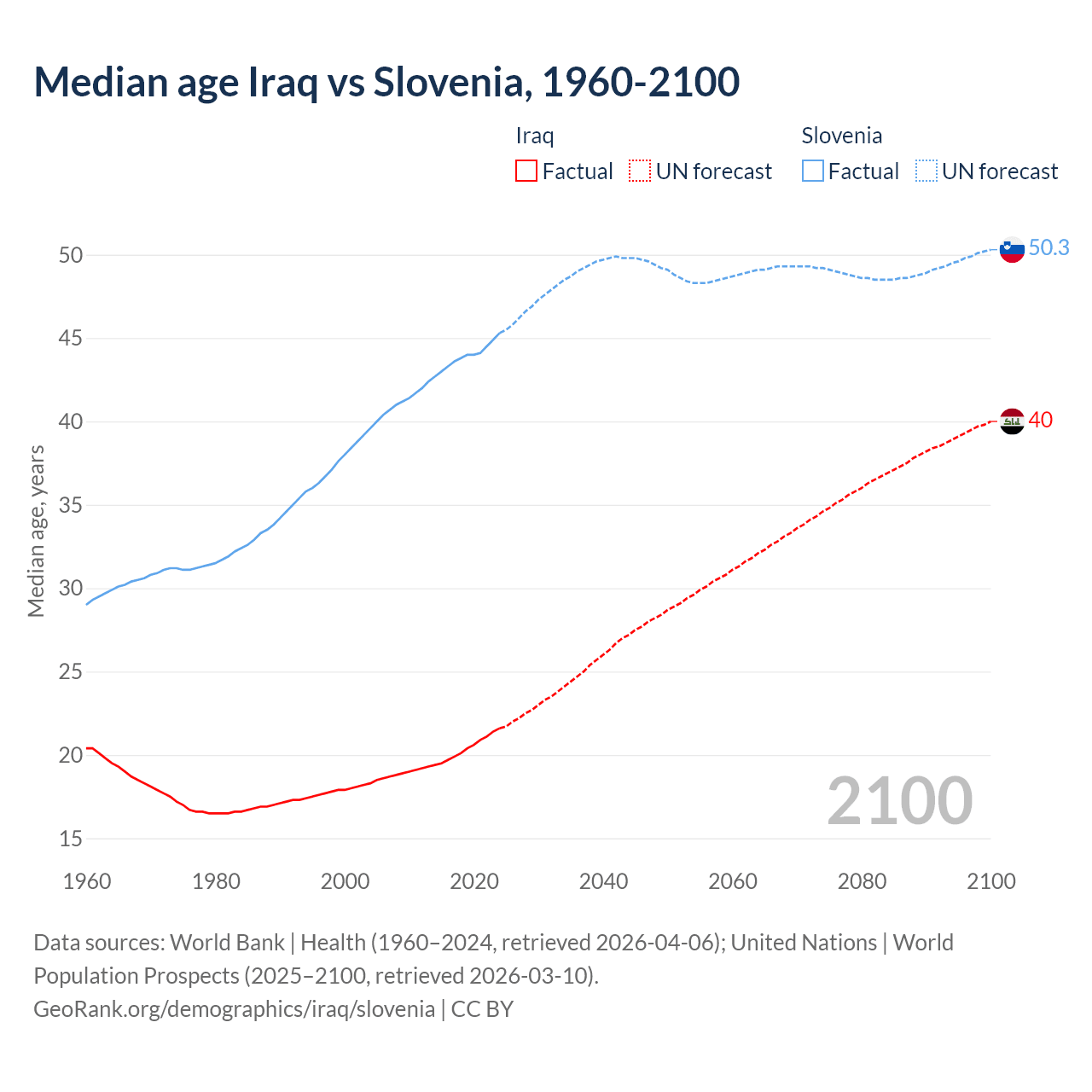 Median age Iraq vs Slovenia, 1960-2100