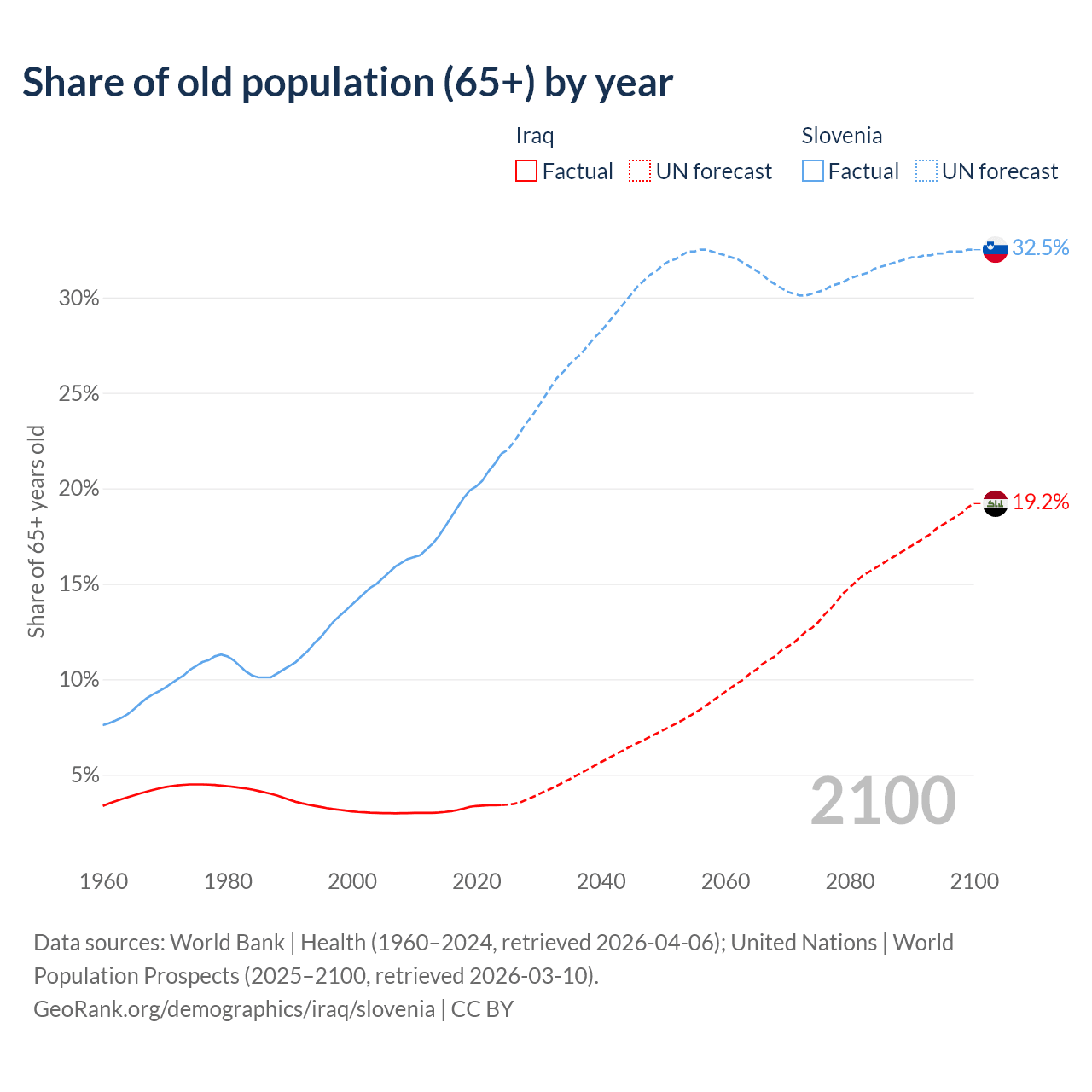 The share of older people aged 65 and over is 3.41% in Iraq and 21.8% in Slovenia. Life expectancy in Iraq compared to Slovenia .