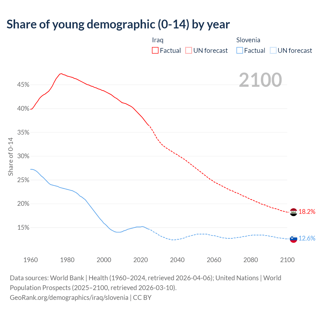 - The share of young demographic (0-15 years old) in Iraq is 36.6% vs 14.7% in Slovenia.