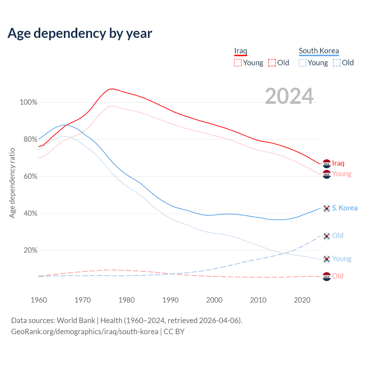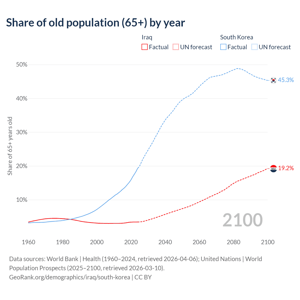 The share of older people aged 65 and over is 3.41% in Iraq and 19.3% in South Korea. Life expectancy in Iraq compared to South Korea .