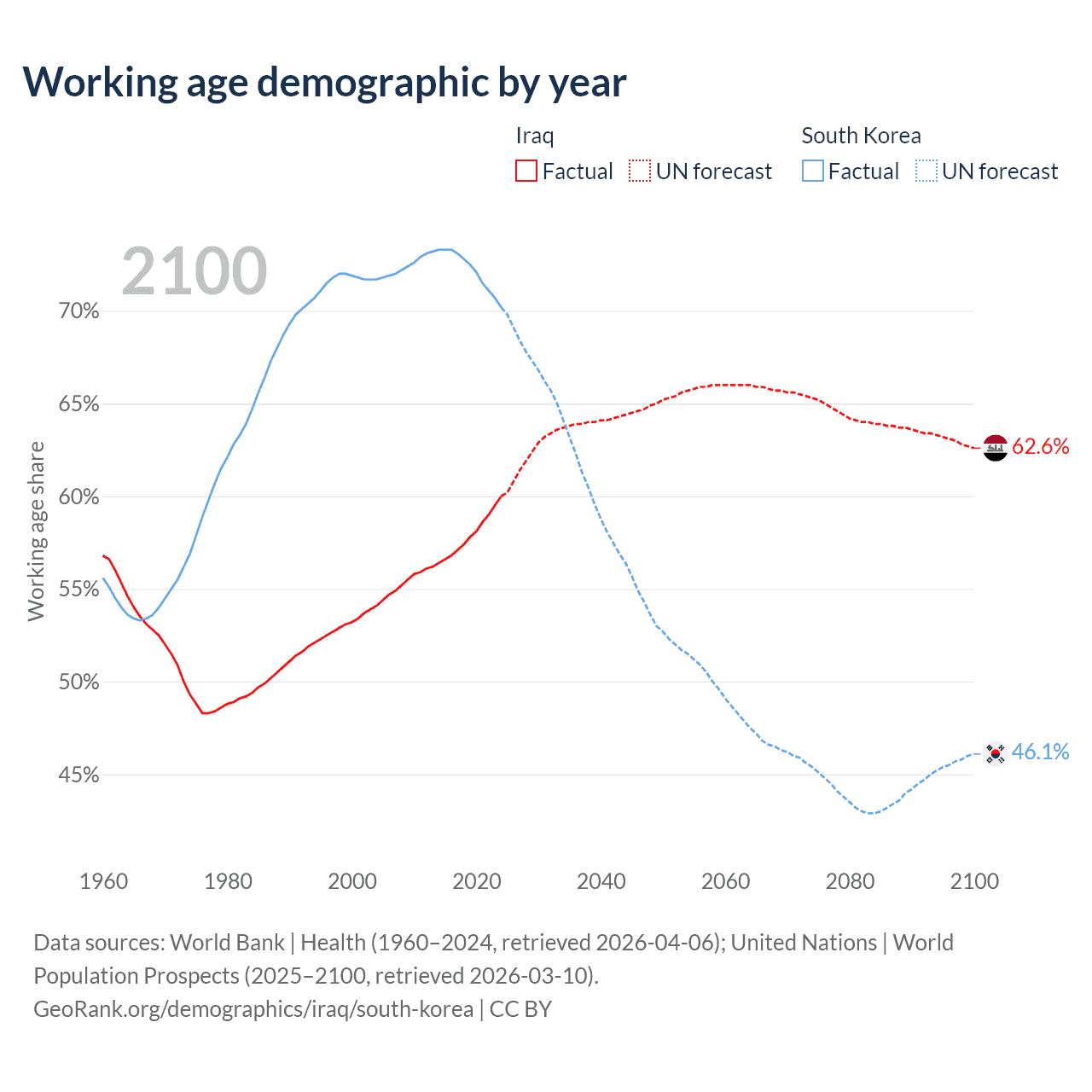 Median age Iraq vs South Korea, 1960-2100