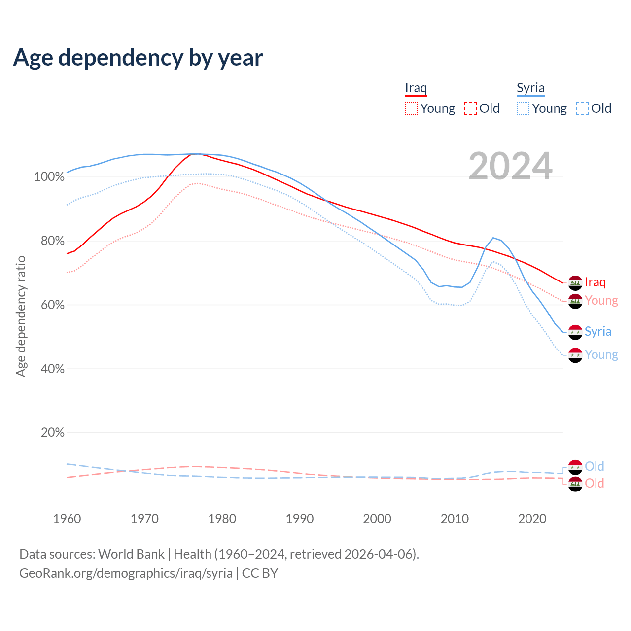 - Iraq is ranked 151/196 by median age (oldest to youngest) vs 138/196 for Syria.