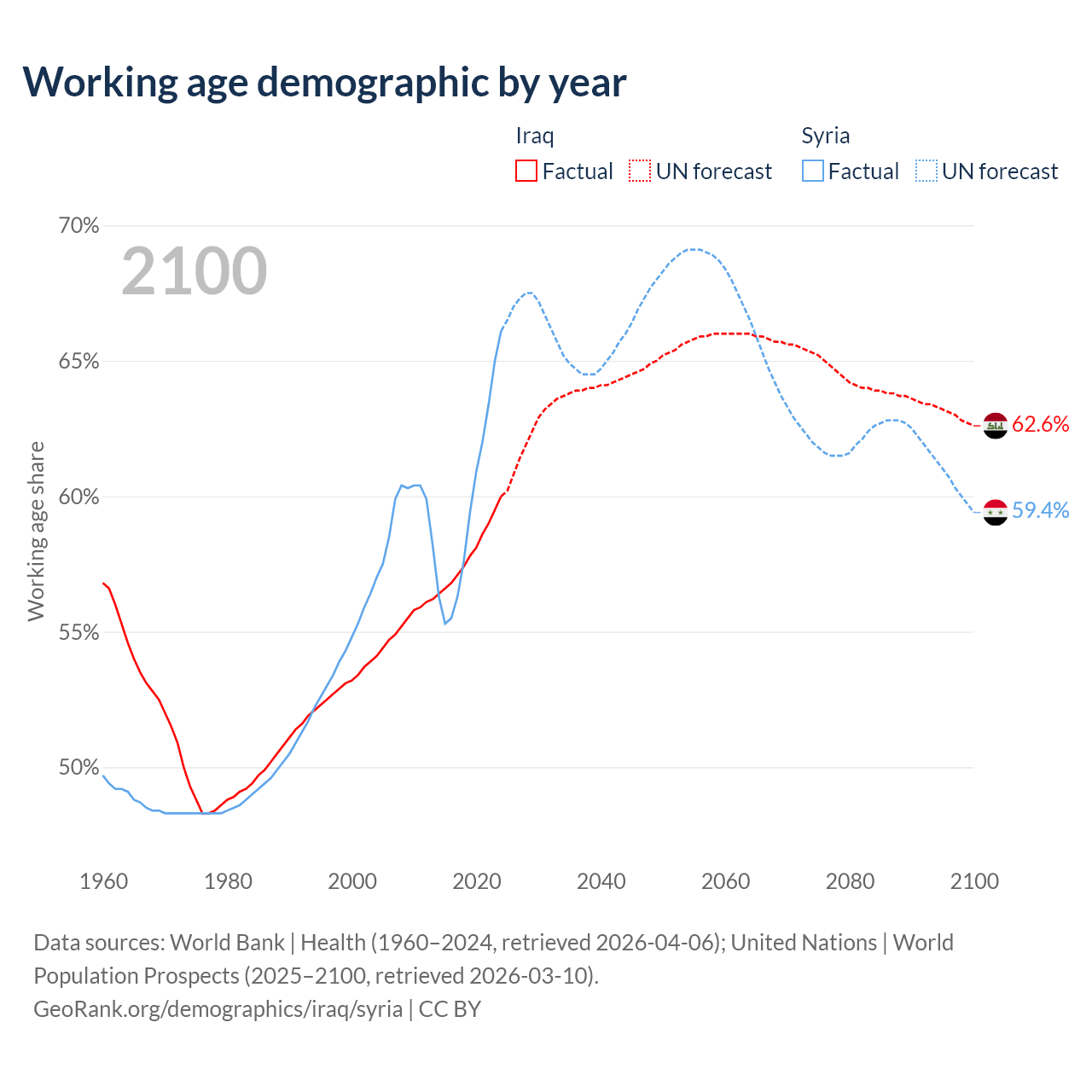 - Iraq has 29M working age adults (aged 15-64) vs 17.7M in Syria.