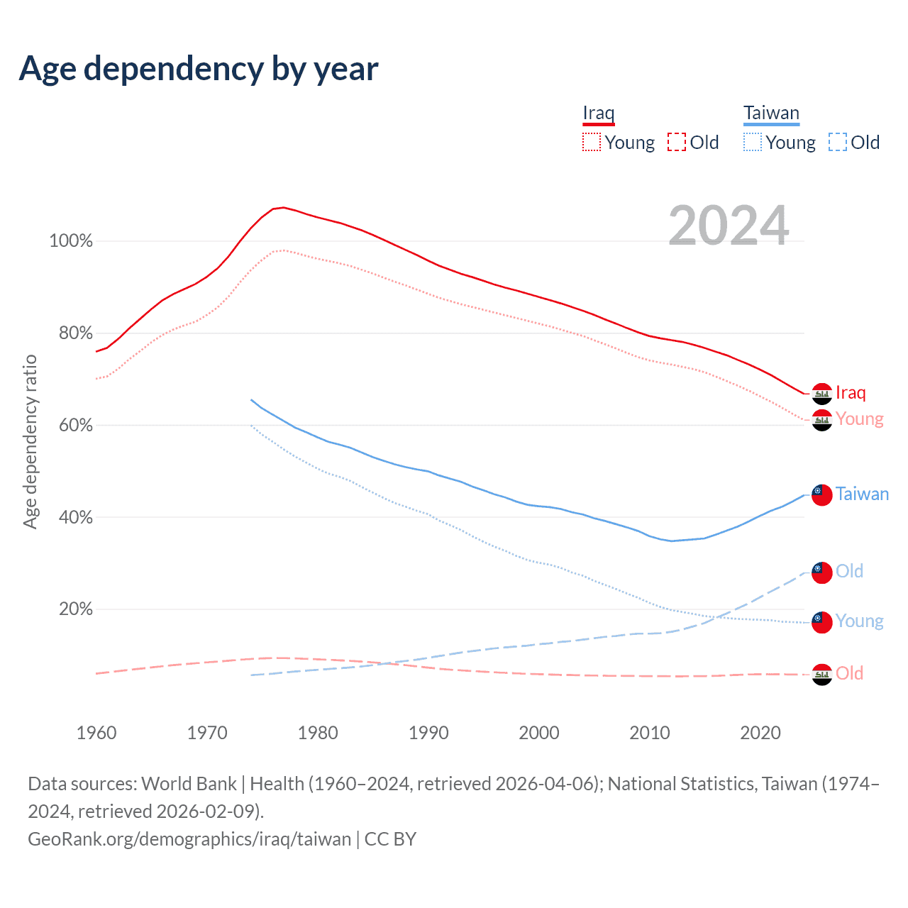 Data sources: World Bank | Health (1960–2024, retrieved 2026-04-06); U.S. Census Bureau (1960–2024, retrieved 2026-02-08); National Statistics, Taiwan (1974–2024, retrieved 2026-02-09).