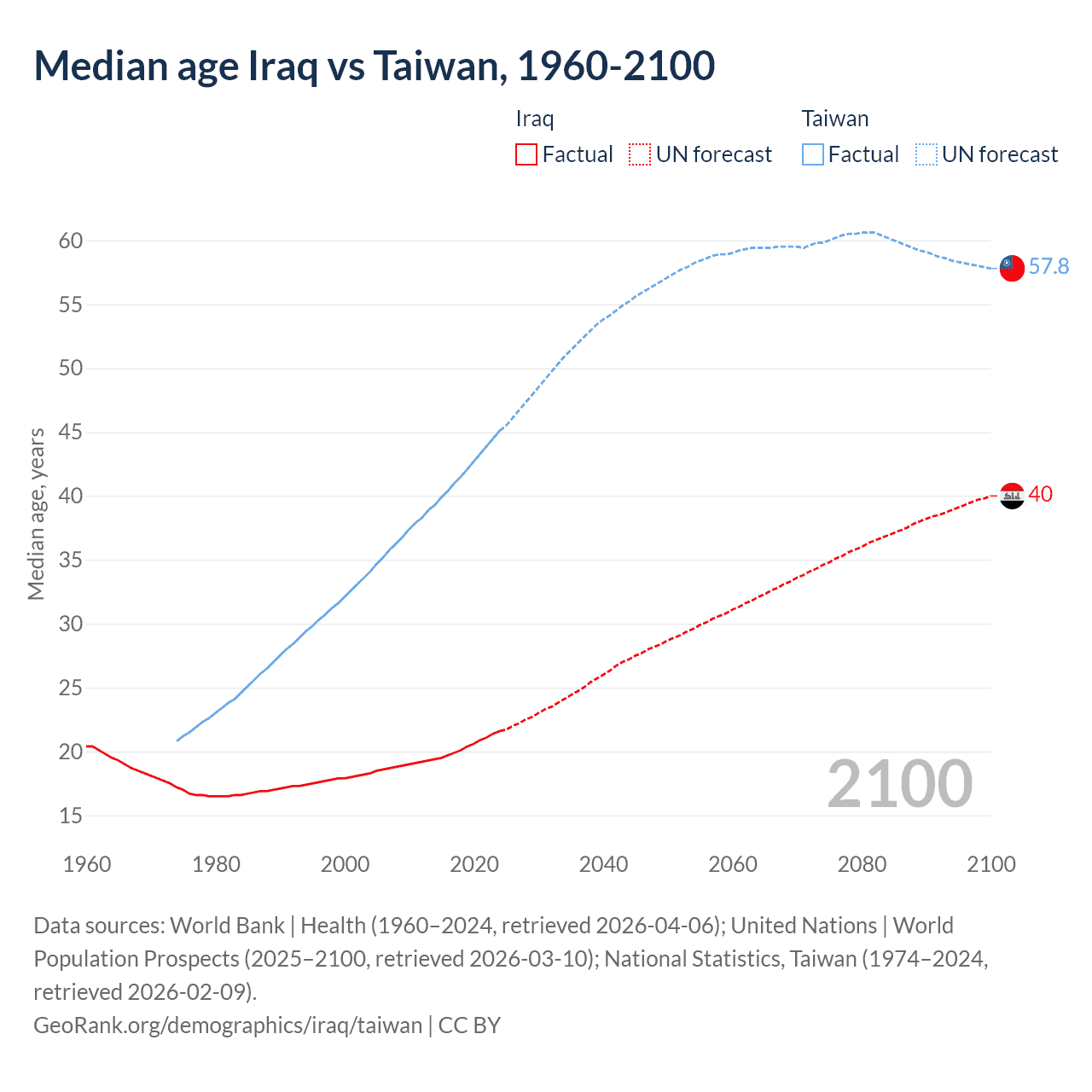 Median age Iraq vs Taiwan, 1960-2100