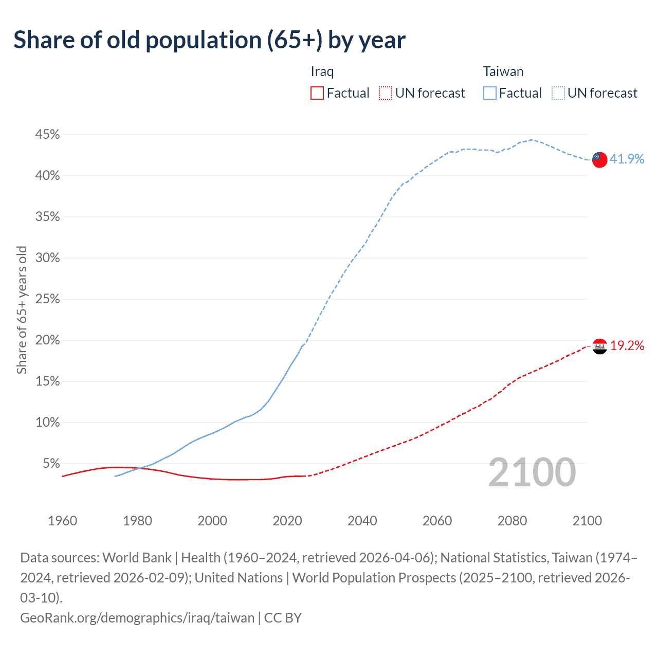 The share of older people aged 65 and over is 3.41% in Iraq and 19.2% in Taiwan. Life expectancy in Iraq compared to Taiwan .