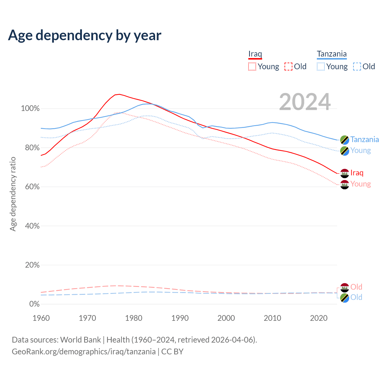 - The share of old-age demographic (65+) in Iraq is 3.41% vs 3.05% in Tanzania.