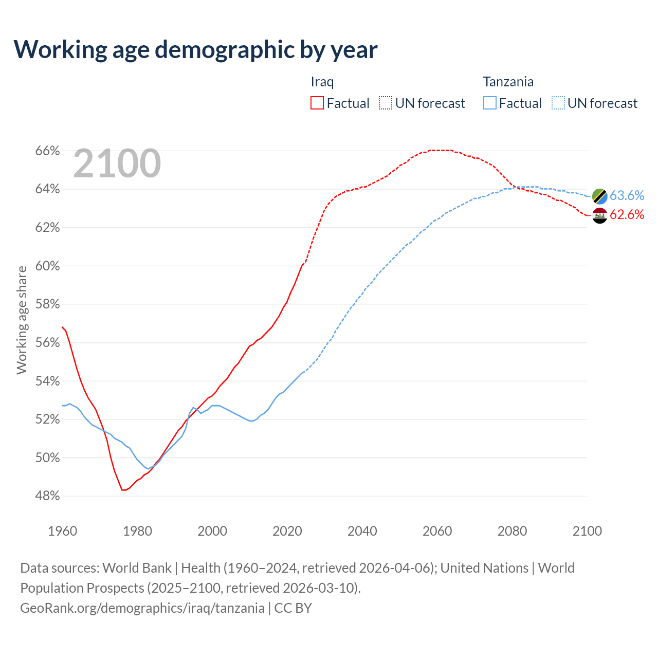 - Iraq has 29M working age adults (aged 15-64) vs 39.8M in Tanzania.